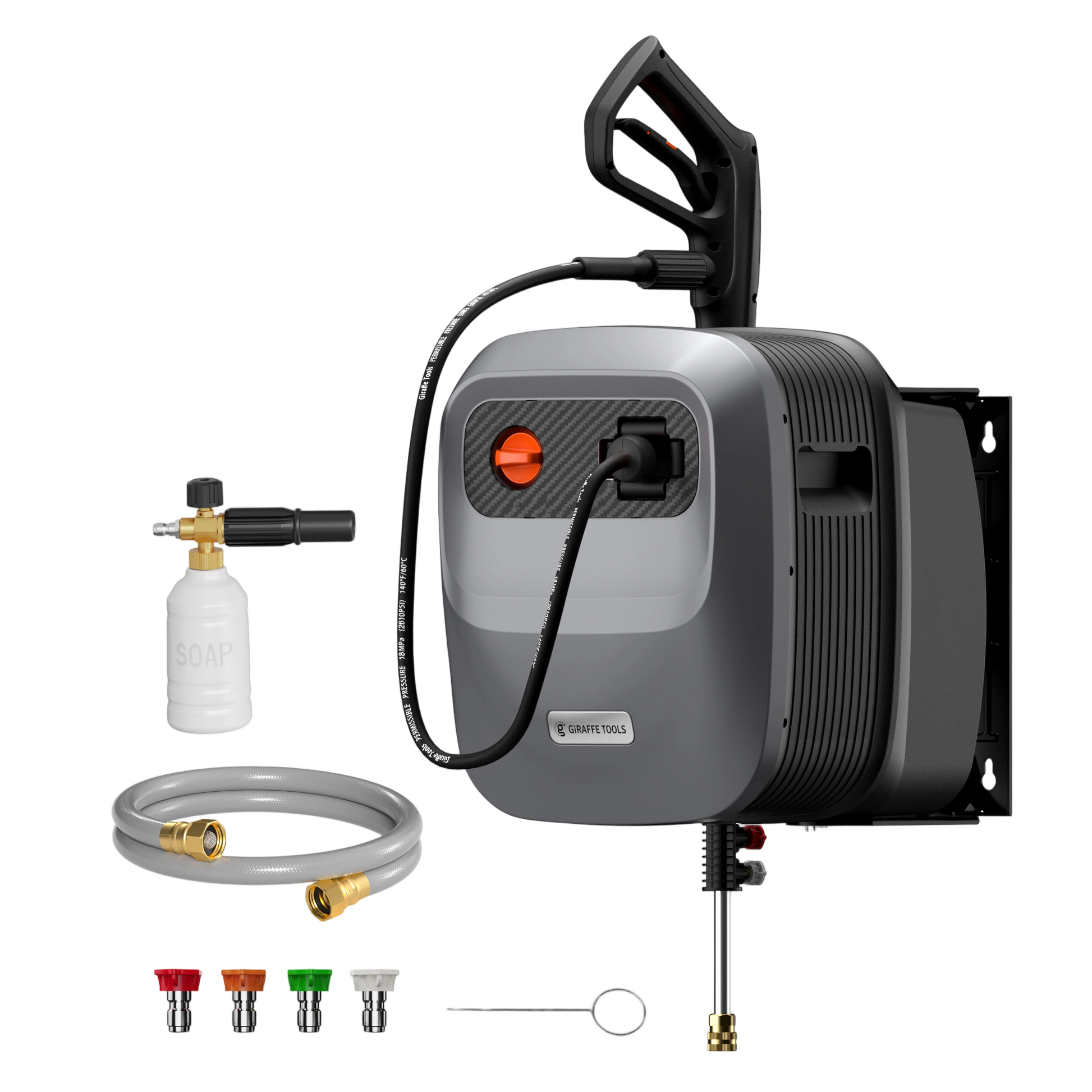 Grandfalls G20 is the newest innovation in our Grandfalls Pressure Washer collection. All-in-one units with a unique rotating wall-mounted design and auto-retract system provide a one-stop cleaning service, making cleanliness and tidiness effortless. No need to think about assembly, just pull out the hose for every use and say goodbye to tedious cleaning.