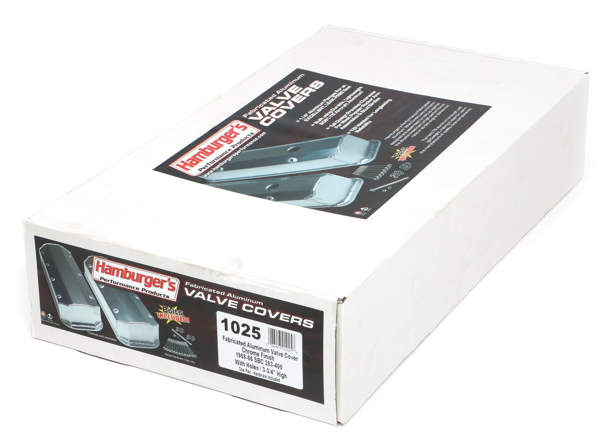 These Polished and Chromed Hamburger's fabricated aluminum valve covers are for use on 1958-86 SB Chevy (283-400) engines. They are super strong, yet very lightweight. They are precision manufactured using 1/4" rails to provide a positive seal and eliminate oil leakage between the valve cover and head. This pair has one baffled breather hole per cover for use with breathers, caps or PCV valve (sold separately). They measure 3-1/4" tall and have a great looking Chromed and polished surface that is easy to maintain. This set includes mounting hardware, but gaskets are sold separately.