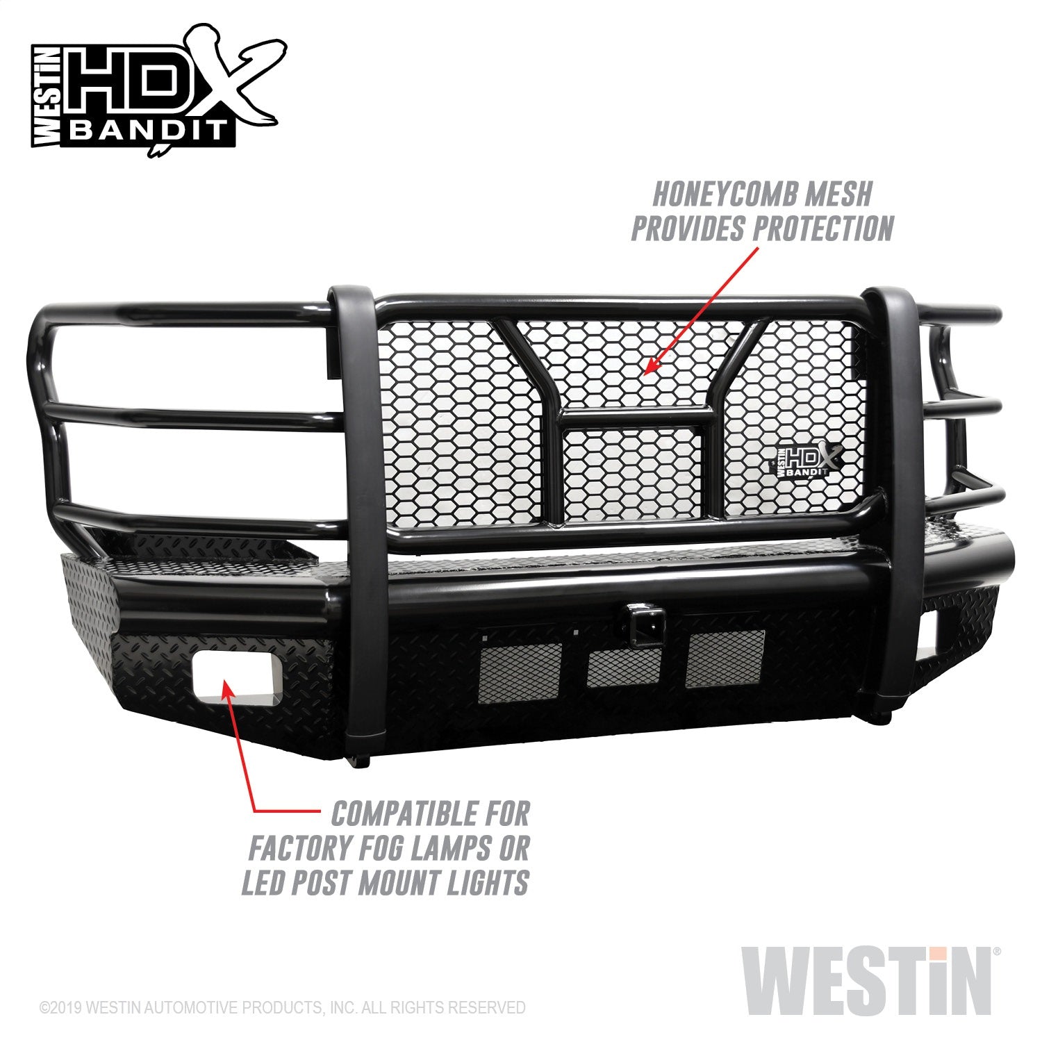 Westins HDX Bandit Bumper combines a heavy duty diamond plate steel bumper constructed of schedule 40 steel pipe with a stylish grille guard featuring 2" diameter outer wraparound wings and 2 3/4" wide upright rubber strips. Designed to protect headlights, grille, hood and front fenders from road hazards, debris and wildlife damage. Features a stylish metal honeycomb mesh screen, which allows maximum airflow to the intercooler or radiator area while accenting the front end styling with a clean and rugged look. Removable mesh screens allow for factory camera and adaptive cruise control options available on some late model Ford applications. HDX Bandit Bumper includes a built-in 2" receiver hitch and (2) heavy duty 9,500 lbs bow shackle mounts, capable of delivering multiple towing options. Compatible for factory fog lamps or LED post mount lights. In addition, some late model Ram and Chevrolet applications feature provisions for factory parking sensors. Bolt-on installation with hardware and mounting brackets included. Available in black powder coat finish.