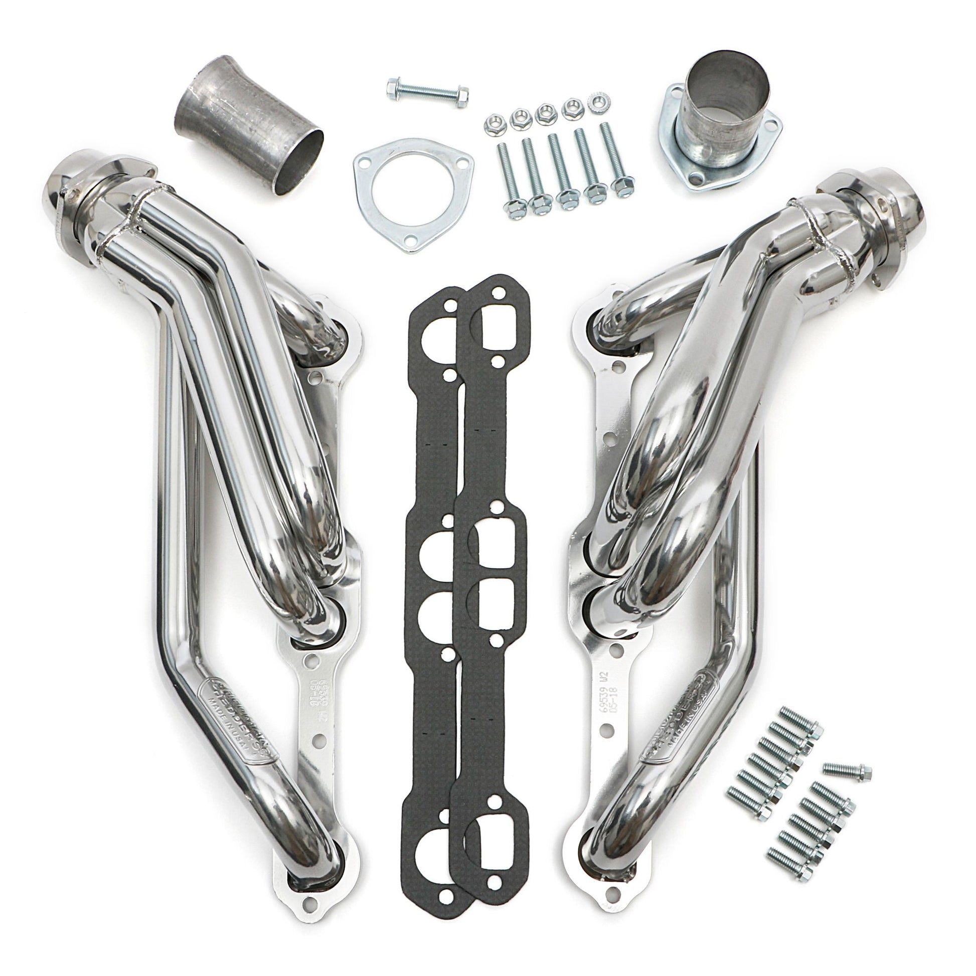 - Contents: Header(s), new bolts, gasket(s) to head, reducer(s) and hardware, instructions