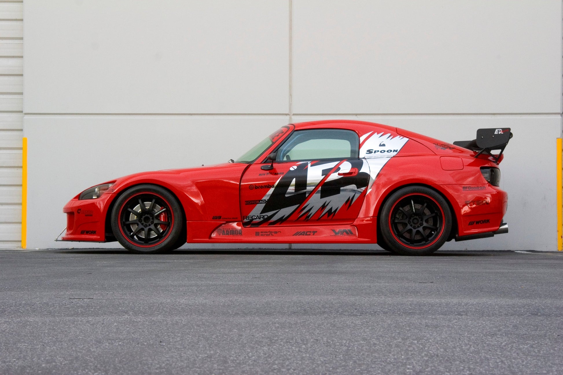 The S2-GT Widebody Aerodynamic Kit for the Honda S2000 brings the performance of a grand touring racecar to the street. To improve overall handling and traction, this aerodynamic kit increases +45mm per front fender and +50mm per rear fender allowing for massive front wheel sizes of 18”x9” with 265/35/18 profile tires and rear wheel sizes of 18”x10” with 285/30/18 profile tires.