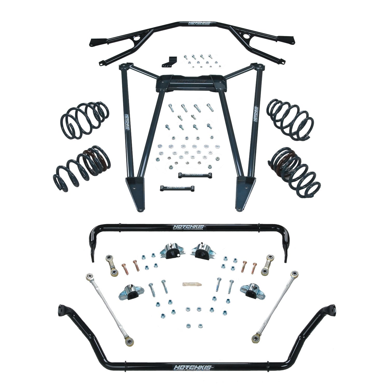 Designed for maximum performance 5th Gen Camaro's headed for autocross and track days the Hotchkis Sport Suspension Race Pack is a tuned balanced complete suspension solution for the Gen 5 Camaro. Born on the track and engineered for razor-sharp handling performance the Race Pack improves steering response and stability eliminates under steer and subframe movement and allows for precise driver control. Starting up front the system includes a strong lightweight Strut Tower Brace designed to clear Magnuson super chargers. To improve vehicle feel and offer a more aggressive stance 1 in. lowered coil sport springs with performance rates are utilized. To control body roll Hotchkis Competition Sway Bars are included a high-strength tubular 1.25 in. front bar and three-way adjustable 1.375 in. rear bar allow you to dial-in the way the car responds to throttle steer and driver input. High quality 3-piece lined end links are included for both front and rear. The Hotchkis Chassis Max undercar brace ties the rear sub frame to the uni-body reducing wheel hop and subframe movement. This brace features Hotchkis exclusive aerodynamic extruded aluminum tubing for maximum weight savings and excellent ground clearance. All necessary hardware and complete installation instructions are included. Kit Includes Lightweight 1.25 in. tubular front bar. 210% stiffer than stock SS. Lightweight 1 3/8 in. adjustable tubular rear bar +500 630 800% stiffer than stock SS. Greasable polyurethane bushings mounts. End links feature highest quality 3-piece PTFE lined heim joints with high articulation spacers and CNC machined aluminum Sleeves with wrench flats. 1 in. Lowered sport coil springs with high performance rates F.210lbs/in R.440 lbs/in. Chassis Max Strut Brace designed to clear Magnuson supercharger systems. Chassis Max underbody brace manufactured from Hotchkis exclusive extruded aluminum arrow tubing. All Necessary Grade 10.9 hardware.