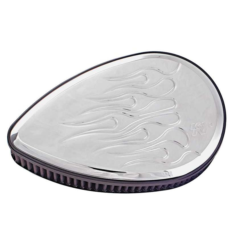 K&N air cleaner assemblies, designed for your Harley-Davidson, are a remarkable combination of performance and style. These air cleaner assemblies are made to increase horsepower and torque by supplying superior air flow. They are machined from billet aluminum, luster polished, then chrome plated to complement your show bike. This K&N custom air cleaner fits select Dyna, Softail, and Touring models. Each K&N air cleaner comes complete and ready to use including, a mounting bracket kit. There's nothing else to buy. Installation is easy, so exceptional performance is only a few steps away with a K&N custom air cleaner. Not only that, but these parts are designed for optimal looks. This teardrop-shaped chrome covered is graced by a vintage flame design.