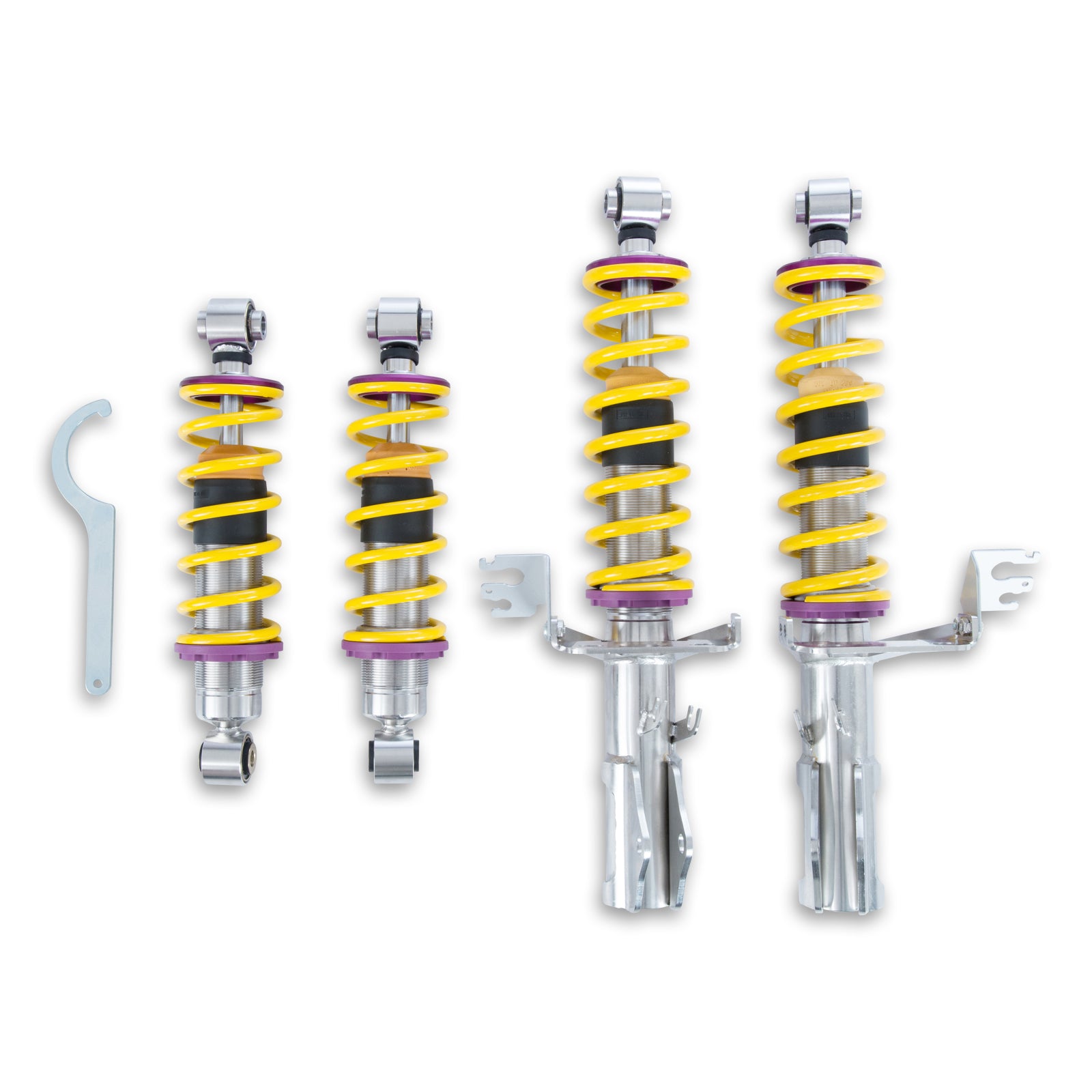 KW V2 INOX-LINE coilovers are the perfect solution for drivers who want more than just outstanding looks and adjustable ride height. In addition to stainless steel coilover struts, and corrosion-resistant components built for long term durability, KW V2 coilovers utilize TVR-A (Twin Valve Rebound - Adjustable) technology -o allow Adjustment -f the rebound damping characteristics with 16 clicks so you can fine tune the ride comfort or performance to your satisfaction. As with all KW coilovers our engineers develop vehicle specific damper settings that undergo comprehensive testing on the Nurburgring Nordschleife and in our KW 7-post Driving Dynamic Test Center. With a KW coilover kit the driving experience is more dynamic and direct. With the rebound adjustability you have more direct influence on the handling or comfort of the car. With 16 precise clicks you can adjust the KW dampers (more firm or more comfortable) without affecting the compression damping fine-tuned by our engineers. The two-stage, patented TVR-A (Twin Valve Rebound - Adjustable) technology -nables a small volume of oil flow through an adjustable, conically shaped, low-speed bypass during low damper speeds, while at high damper speeds, the main rebound stage valve opens allowing a larger volume of oil to flow. This provides a big improvement in terms of ride comfort without influencing the high-speed range. There are 16 precise clicks available for individual settings, so you can choose between more comfort or more body control. For over 20 years, KW automotive has been the market leader and driving innovation as a manufacturer of individual suspension solutions for the road and in all types of motorsports. No matter where in the world, gearheads, automobile manufacturers and reputable tuners rely on our KW coilovers made in Germany. With an application list comprising more than 4,600 options KW guarantees an outstanding selection backed by our Limited Lifetime Warranty.