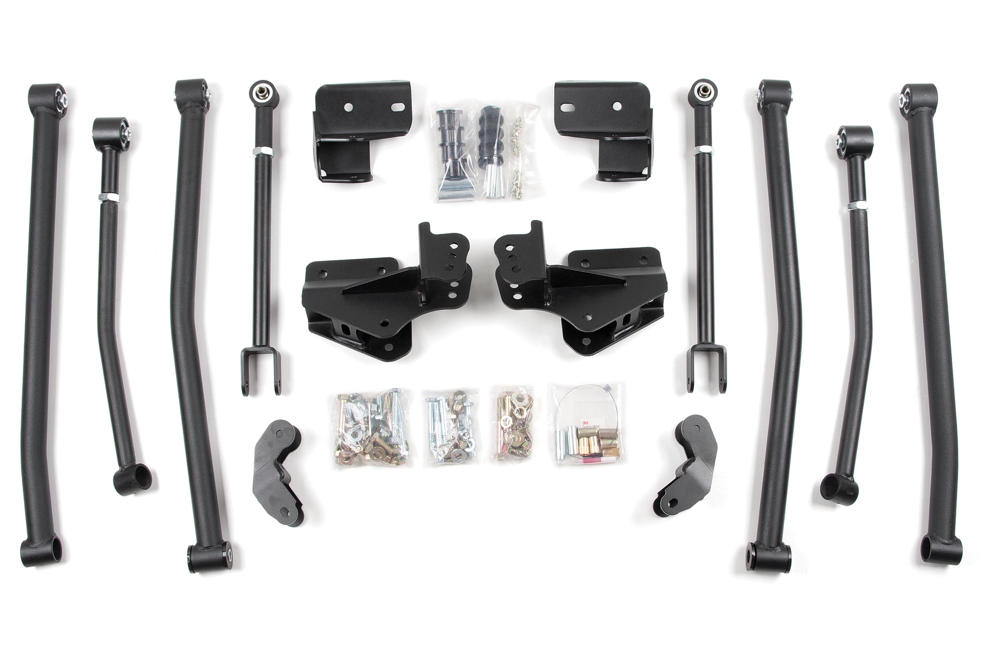The system includes upper adjustable flex long arms that utilize the factory rubber bushings at the axle mount and lower adjustable flex long arms with rubber ends at the axle for maximum driver comfort and reliability. The control arms are equipped with BDS Gen II forged flex eyes to allow for maximum articulation. Additionally the system includes a complete control arm mounting system.