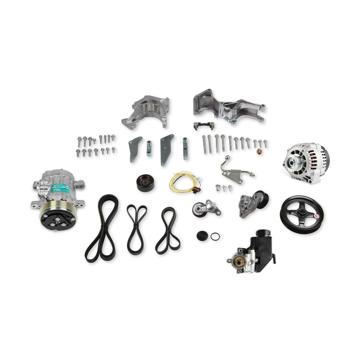 Holley's new Low Mount Accessory Drive Brackets and Complete Systems have the components tucked in tighter to the block and mounted lower for a more attractive and compact package. Ideal for LS engine swaps with limited space or where a low, more attractive appearance is desired. The Low LS bracket and complete kits fit the middle spacing (installation kit # 21-4 is REQUIRED with the Long crank pulley). Low LS Accessory Drive Fits Middle and Long accessory spacing only (does not fit Short accessory spacing Corvette/CTS-V/G8). Customers w/ short spacing can swap out water pump and crank pulley to convert to middle or long spacing. Long Spacing requires Installation kit 21-4. For all LS Engine Swaps-Please refer to your specific body style engine mount kits for additional modification and fitment requirements.