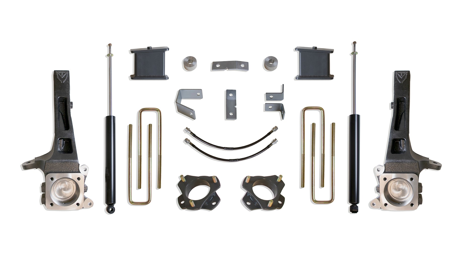 MAXTRAC SUSPENSION'S KIT# K886864 IS A COMPLETE 6.5" LIFT KIT INCLUDING SPINDLES, SPACERS, EXTENDED BRAKE LINES, BLOCKS, U-BOLTS, CARRIER BEARING KIT & MAXTRAC REAR SHOCKS