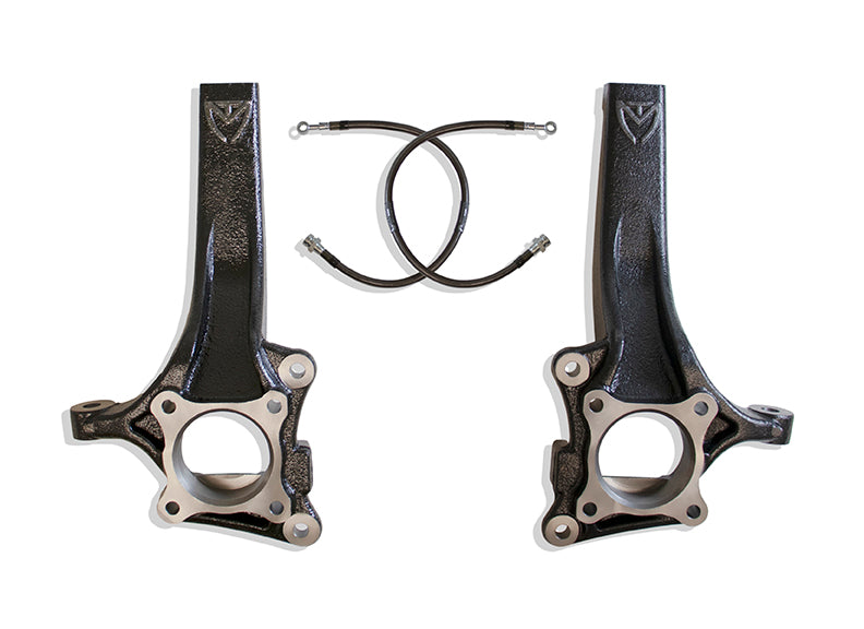 MAXTRAC SUSPENSION'S PART# 703440 IS A PAIR OF 4" LIFT SPINDLES W/ EXTENDED BRAKE LINES MADE FROM DUCTILE STEEL & E-COATED BLACK