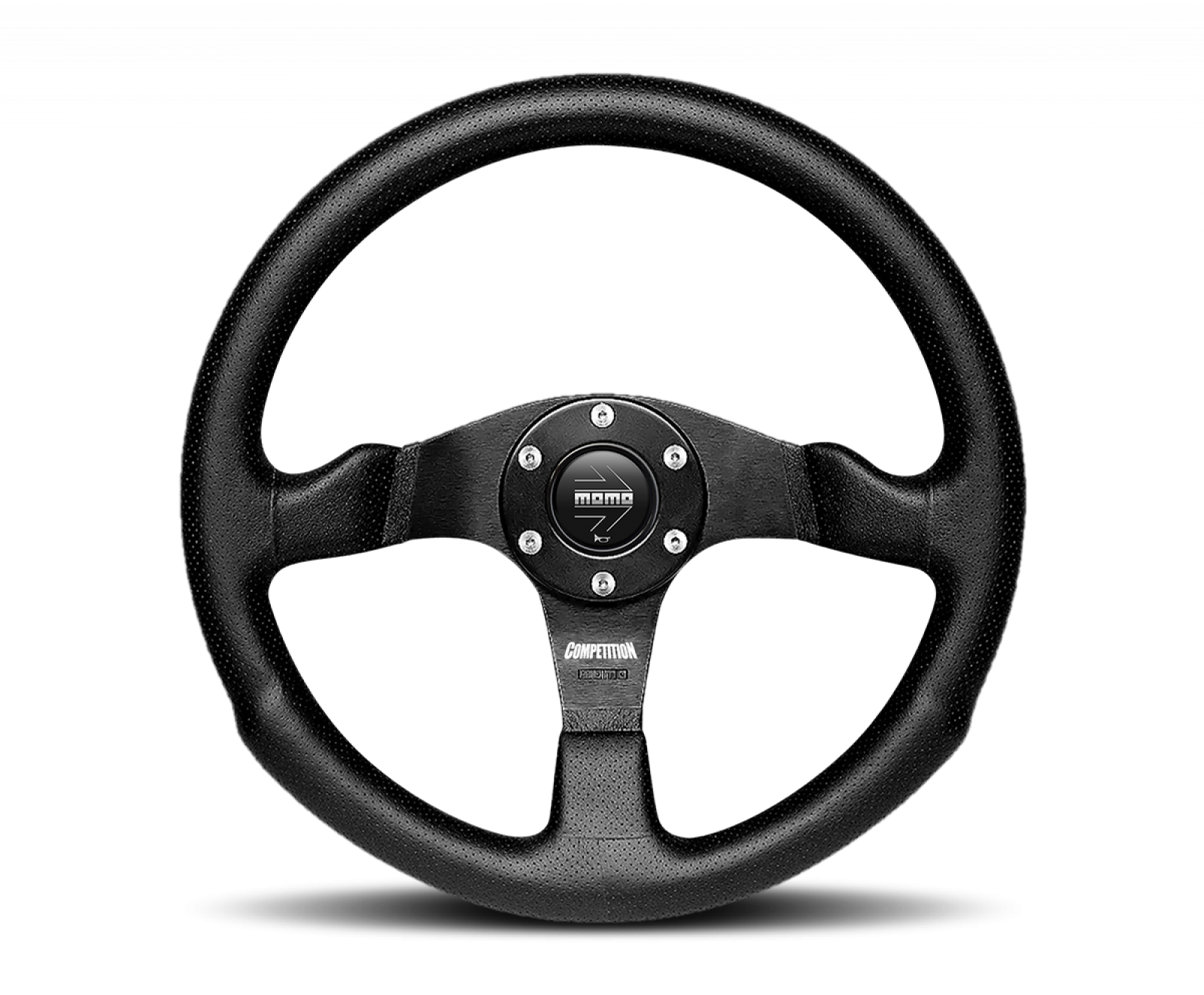 The Competition steering wheel by MOMO features sculpted thumb slots angled slightly downward for improved comfort. "Competition" is lasered on the bottom black spoke and a black MOMO horn button with black anodized aluminum ring complete the look. It is covered in airleather and comes with a moderate 40mm dish on a 350mm diameter and is pre-drilled in the standard 6-bolt pattern.