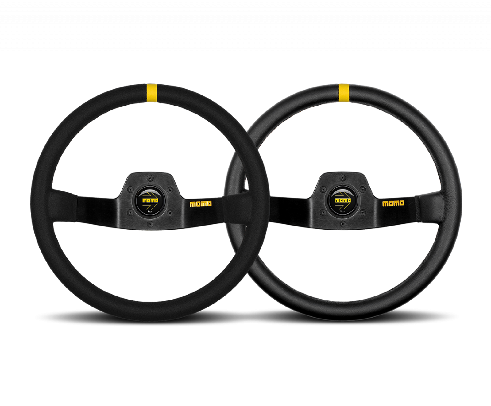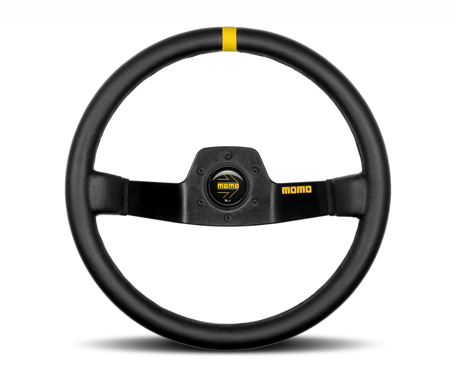 The MOMO MOD. 02 steering wheel is a traditional round design with a 350mm diameter and a unique 2-spoke design. A deep 87mm dish brings the wheel closer to the driver for easier steering input. A yellow centering stripe is also integrated into the design.