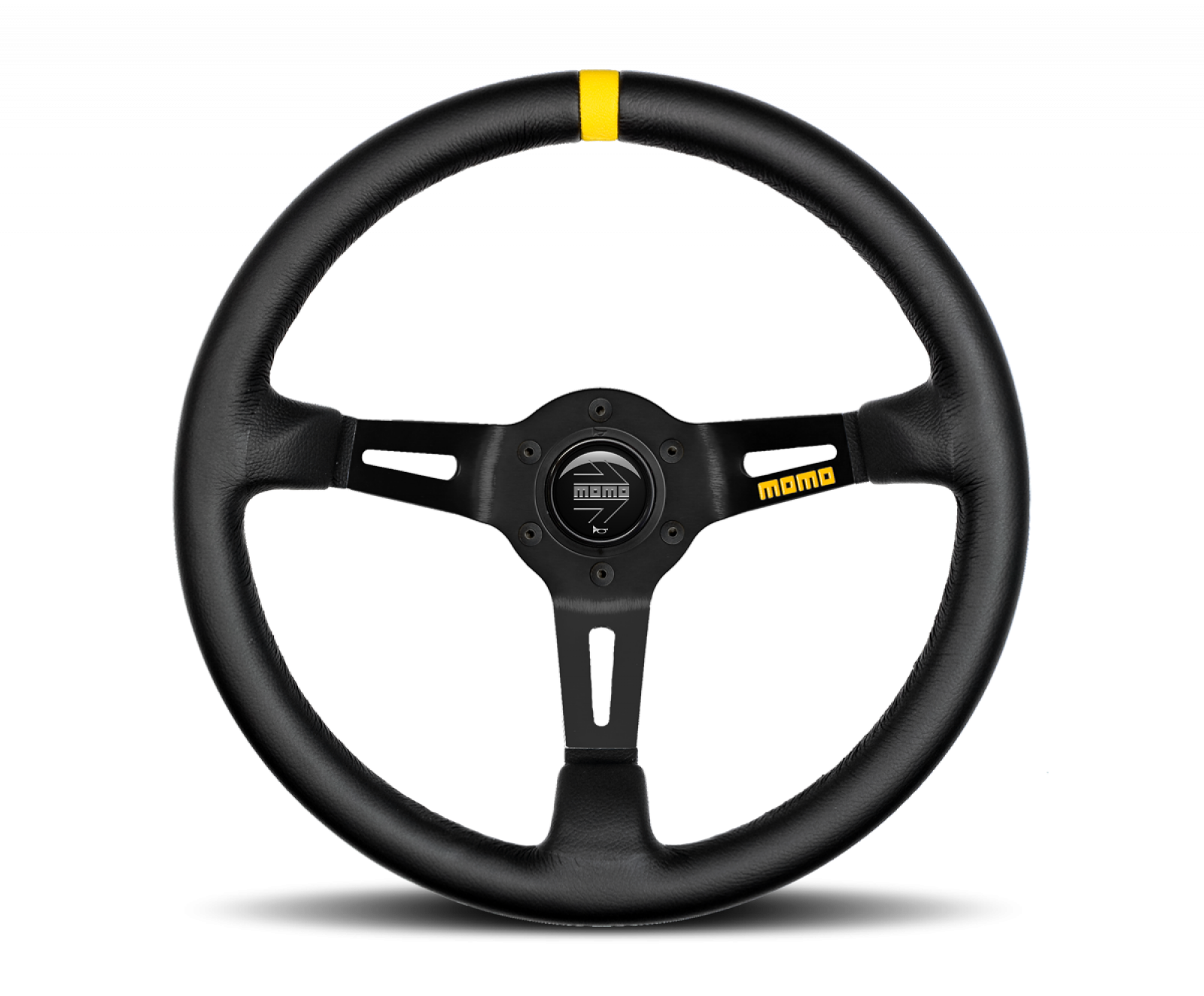 The MOMO MOD. 08 steering wheel has a deep 88mm dish, which is useful for older cars where the seating position is often further back. It also provides extra leverage for cars without power steering. The wheel features a 350mm diameter and a yellow centering stripe is also integrated into the design. The wheel comes with a horn button and is pre-drilled with the standard 6-bolt pattern. This is the black leather covered version.