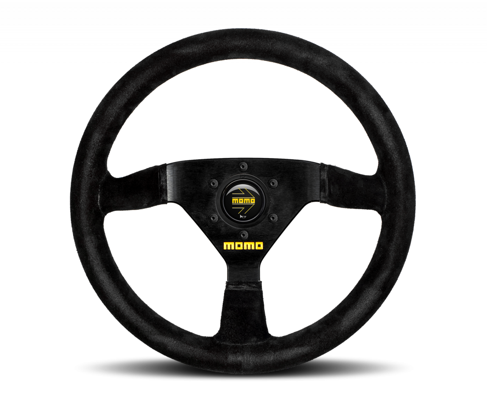 The MOMO MOD. 69 racing steering wheel is best suited for bigger sedans and GT cars. The MOD. 69 is a three-spoke steering wheel featuring a thick round-section grip with finger notches on the backside and a moderate dish of 39mm. The MOD. 69's 350mm diameter rim is covered in premium suede. The black anodized center includes a MOMO horn button and is drilled in the standard 6-hole pattern.