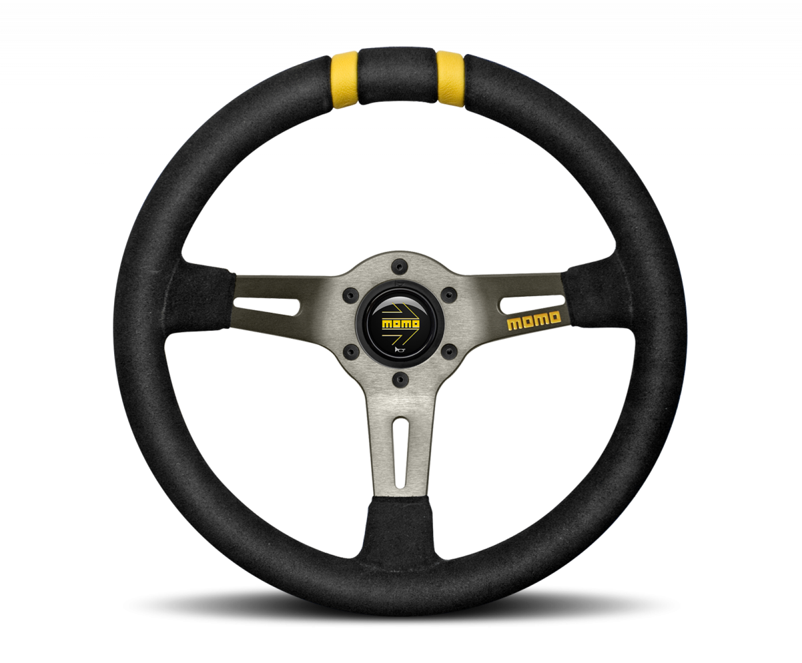 The MOMO MOD Drift steering wheel is specifically designed for better grip and handling in drifting competitions. The MOD Drift's three-spoke steering wheel is built with finger notches on the back and thick grip sections. The black suede covered rim with twin yellow centering stripes at the top, provides drivers with a quick reference guide. One of the three black anodized spokes features the MOMO yellow logo. The diameter is 330mm and it features a deep 88mm dish. A MOMO horn is button included and the wheel is pre-drilled in the standard 6-bolt pattern.