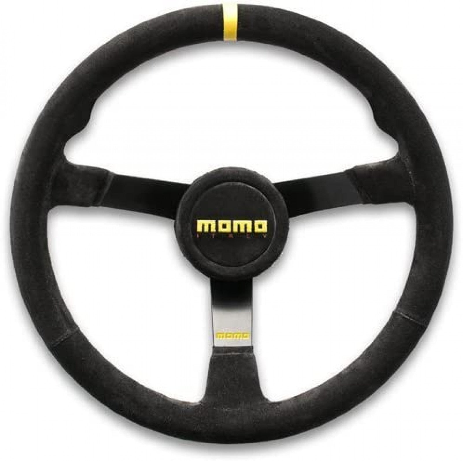 The black suede grip of the MOMO R1971/38S Mod N38 Steering Wheel, accented by a Yellow Top Marker, creates a subtly elegant appearance for a steering wheel that boasts both comfort and style. A padded MOMO logo decorates the center of the wheel, providing additional flair.