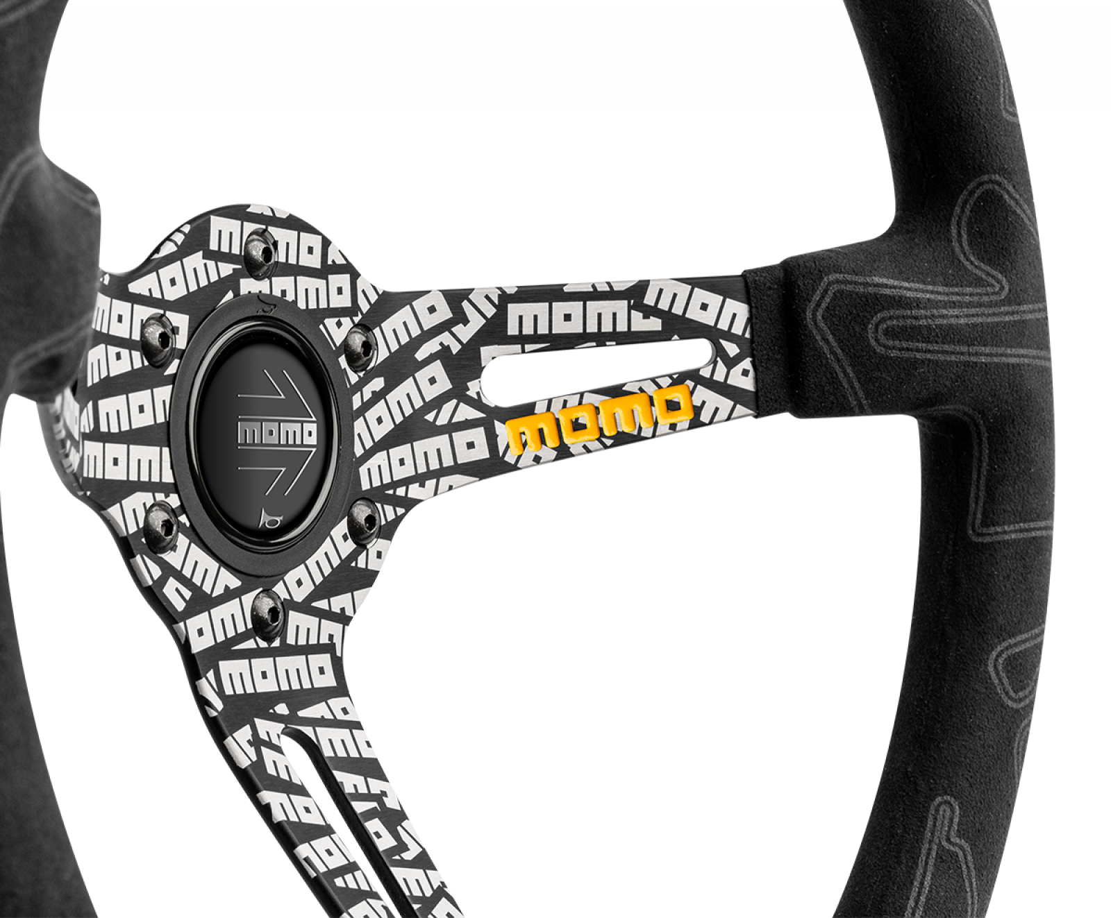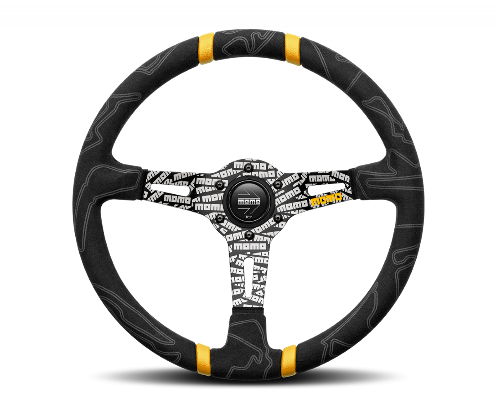 Elaborately etched with the MOMO logo through an innovative laser engraving process, the MOMO ULTRA steering wheel makes a bold statement. The Alcantara wrapped grip features silhouettes of the most famous racetracks from around the world: Monza, Nurburgring, Monte Carlo, Sepang and many more. The double leather inserts provide a stark contrast and serves as quick reference for extreme driving. 350mm by 90mm dish, 38mm by 28mm grip area. 6x70mm bolt pattern, comes with horn button. This listing is for the Black version.