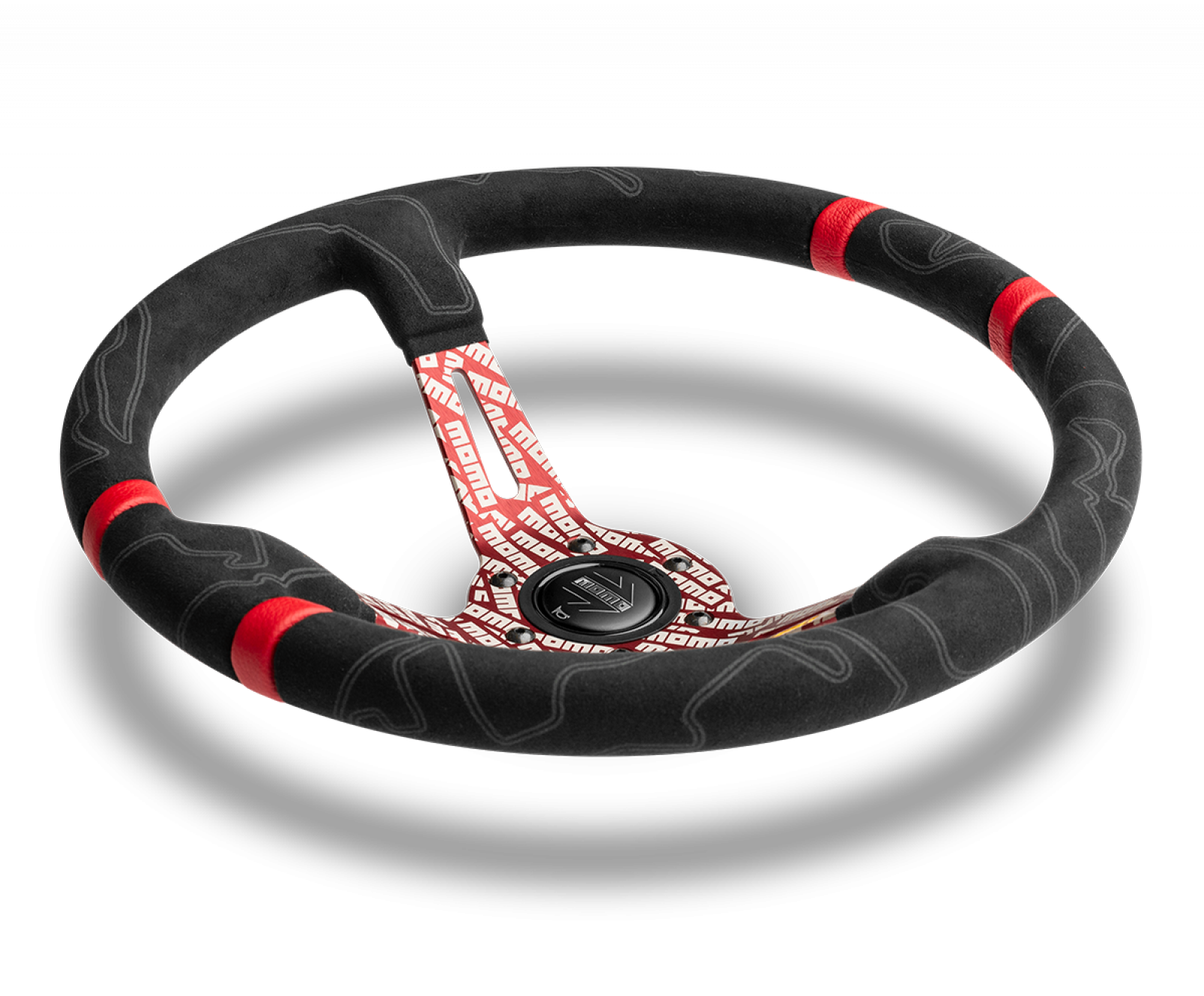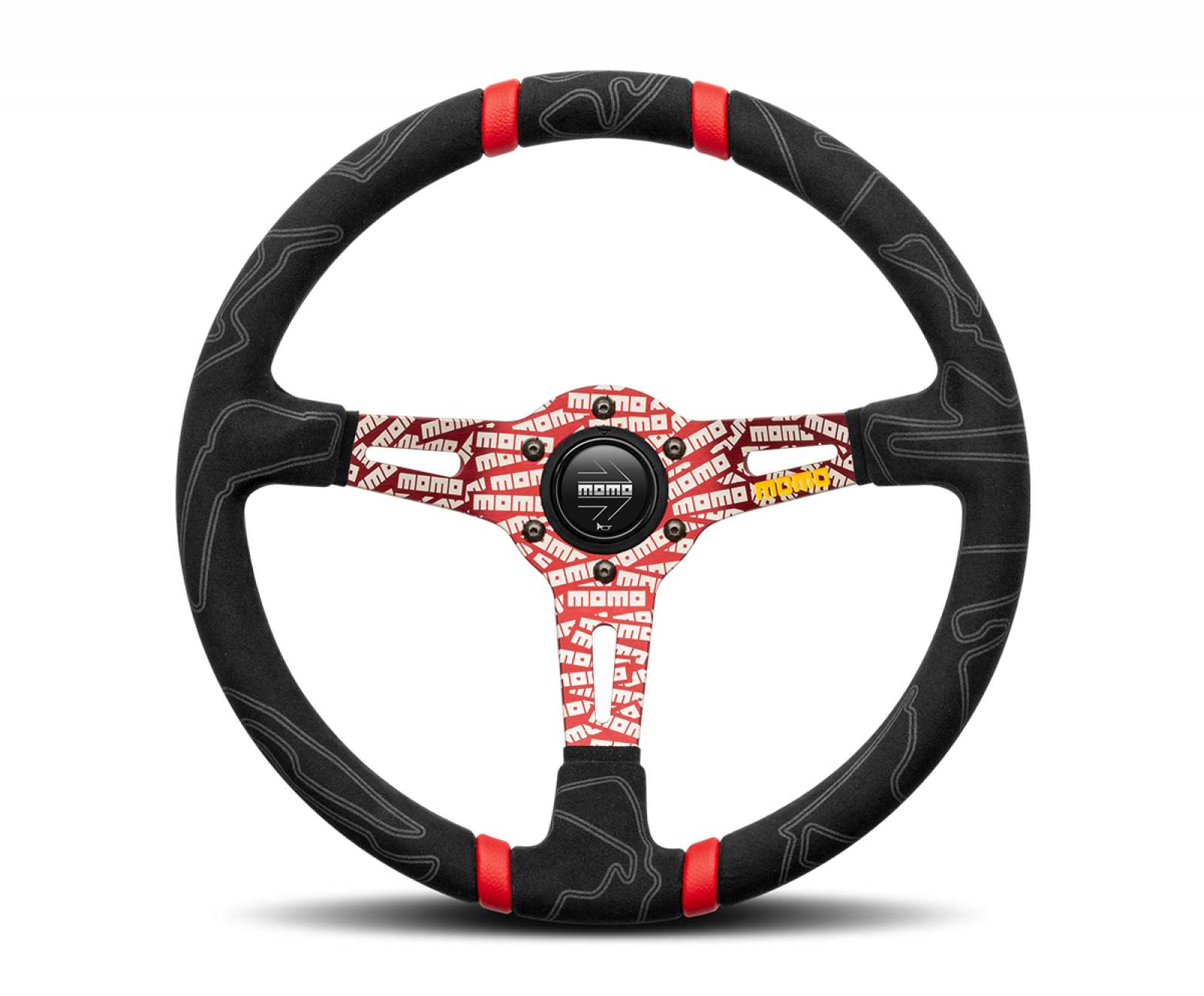 Elaborately etched with the MOMO logo through an innovative laser engraving process, the MOMO ULTRA steering wheel makes a bold statement. The Alcantara wrapped grip features silhouettes of the most famous racetracks from around the world: Monza, Nurburgring, Monte Carlo, Sepang and many more. The double leather inserts provide a stark contrast and serves as quick reference for extreme driving. 350mm by 90mm dish, 38mm by 28mm grip area. 6x70mm bolt pattern, comes with horn button. This listing is for the Red version.
