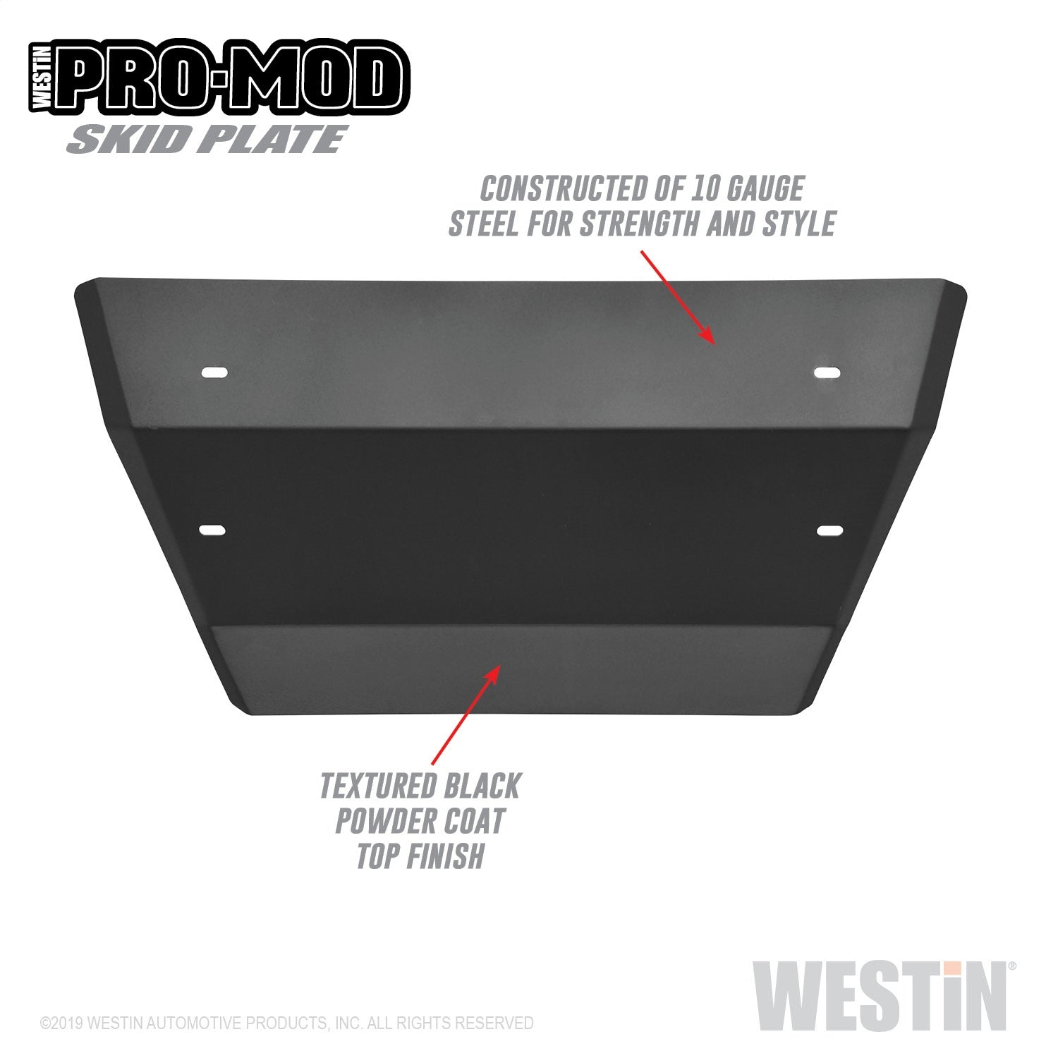 Westin's Pro-Mod Skid Plate is constructed of durable 10 gauge steel to protect your vehicle from damage caused by road debris. It mounts directly to the frame and includes a laser-cut Westin logo. Offers bolt-on installation so no drilling is required. Hardware and mounting brackets included.