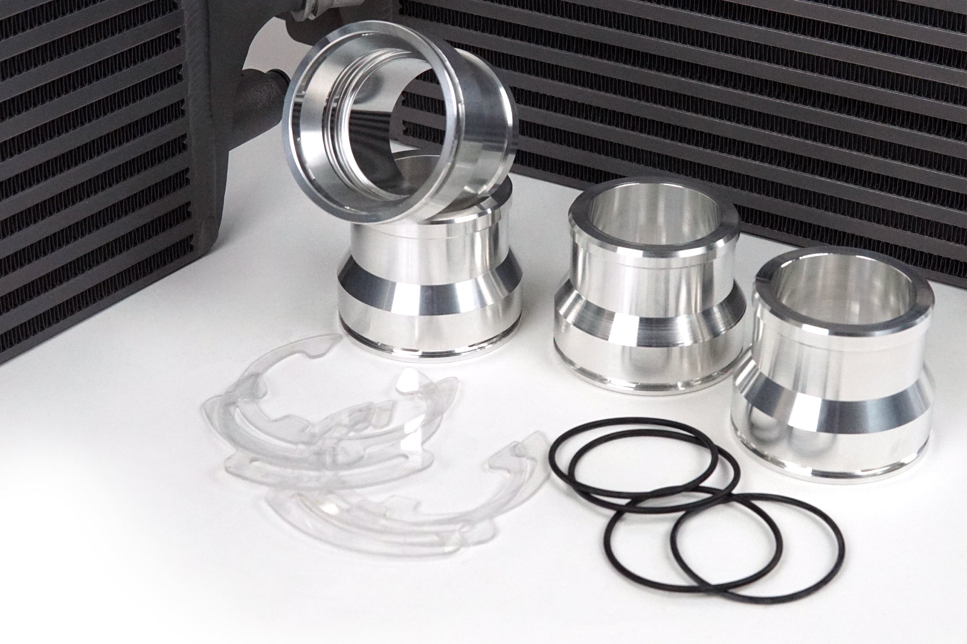 The 991 911 Turbo is an amazing piece of German engineering. The CSF Intercoolers (CSF #8112) allow you to safely run much higher boost levels resulting in significant power gains. Those intercoolers were designed and engineered to work with the factor inlet & outlet pipes for easy installation. However, CSF understands that many owners like to upgrade parts like the inlet and outlet pipes/hoses and many of them are designed for a slip-on connection. These Porsche 991 Turbo Adapter Fittings allow you to use aftermarket slip on style charge pipes with the CSF High Performance Intercoolers.