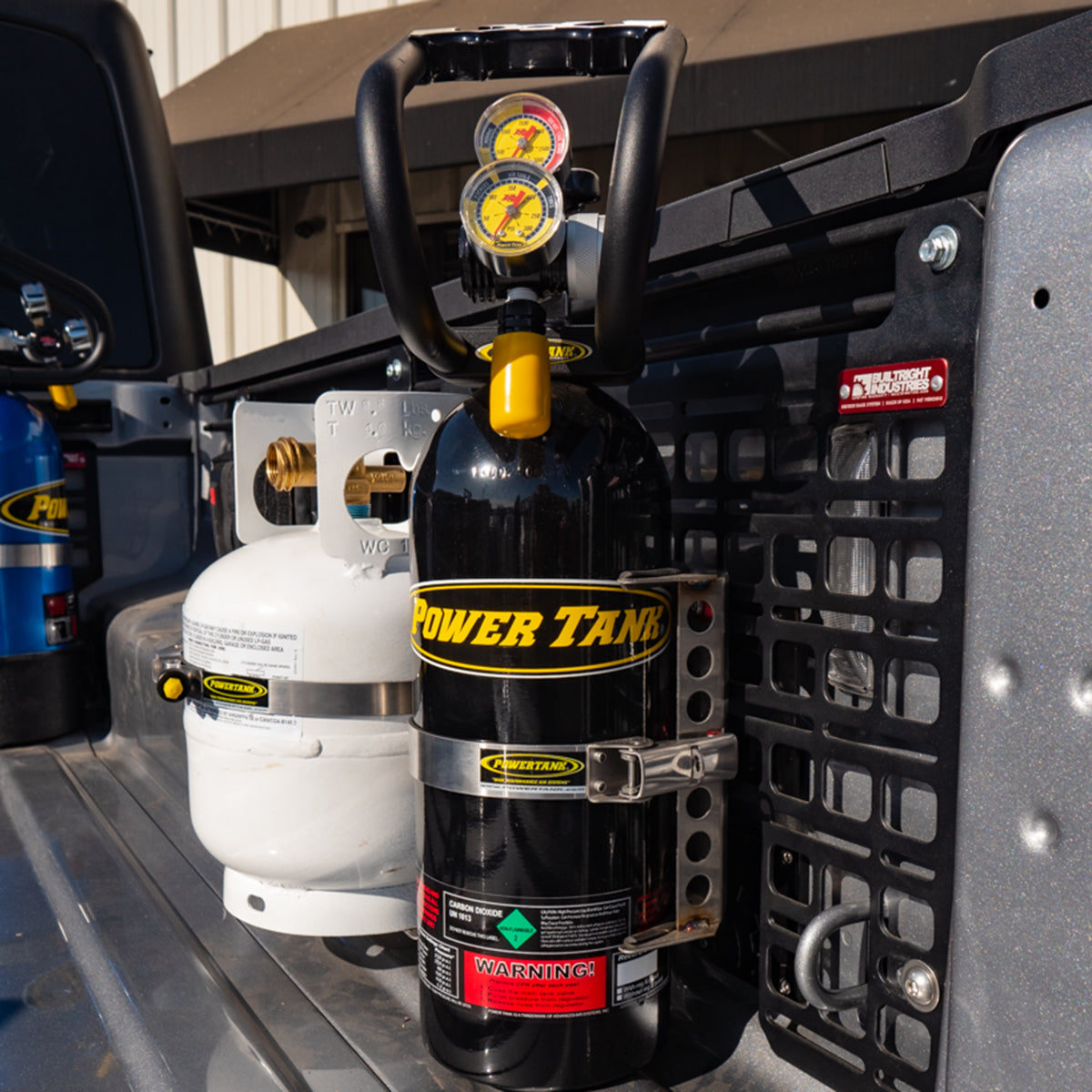 The Power Plate is a clean and simple way to mount a Power Tank or a propane tank to your MOLLE panel or bedside rack organizer in the bed of your Tacoma, Gladiator, or other pickup.