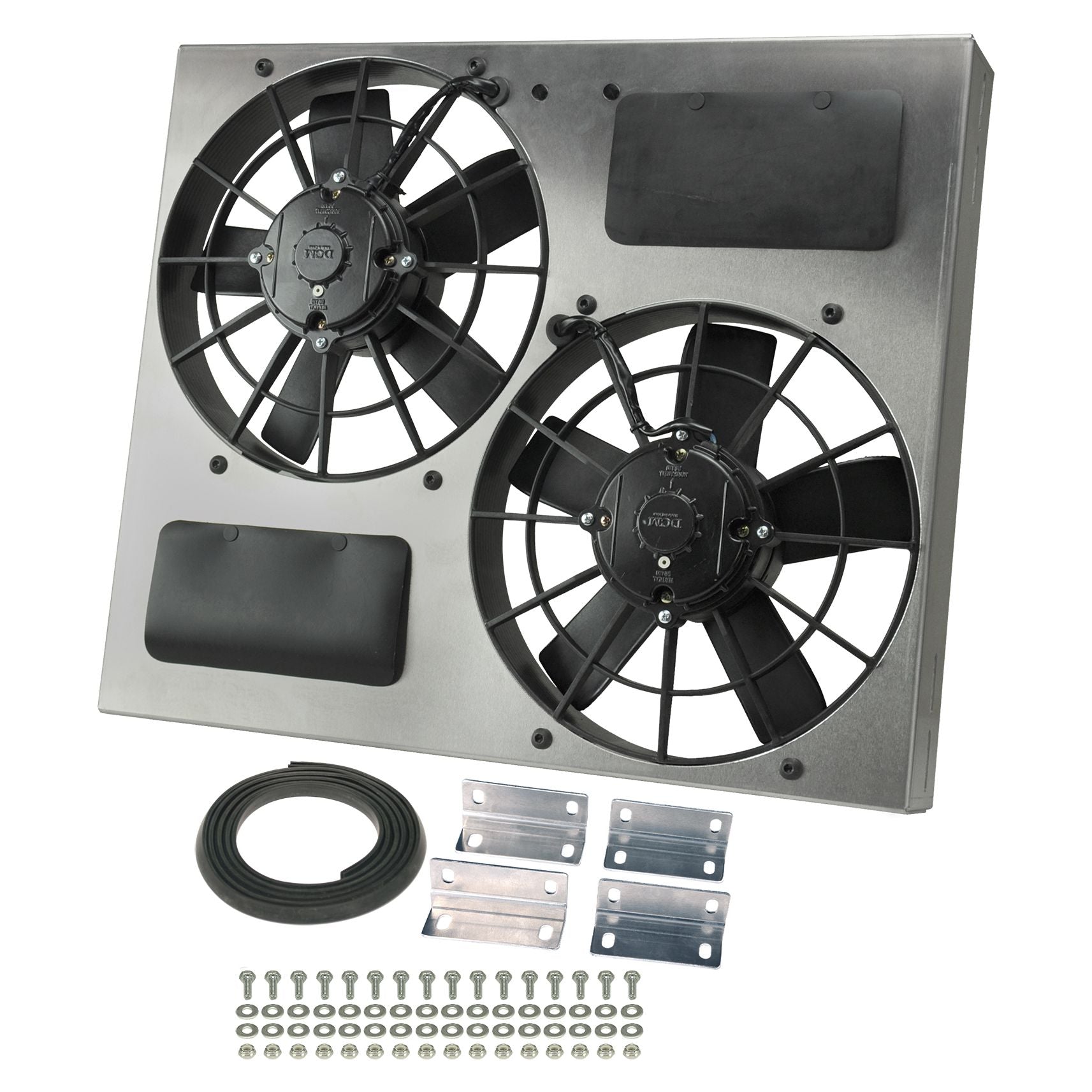 This Dual High Output RAD Fan Powerpack Assembly allows true Dual Fan performance in a package the size of others Single shrouded fans. Featuring an aluminum shroud measuring a tidy 22 1/2" wide by 19" top to bottom and only 4 1/2" in overall depth to offer an adjustable yet precision fit, it uses two IP-68 certified waterproof/dustproof 11" electric fans to provide a powerful one-two 3750 cfm punch to a hot engine. The natural, non-finished aluminum shroud gives the user the freedom to polish, anodize, paint, or simply leave it raw to create a truly custom look at a reasonable price.