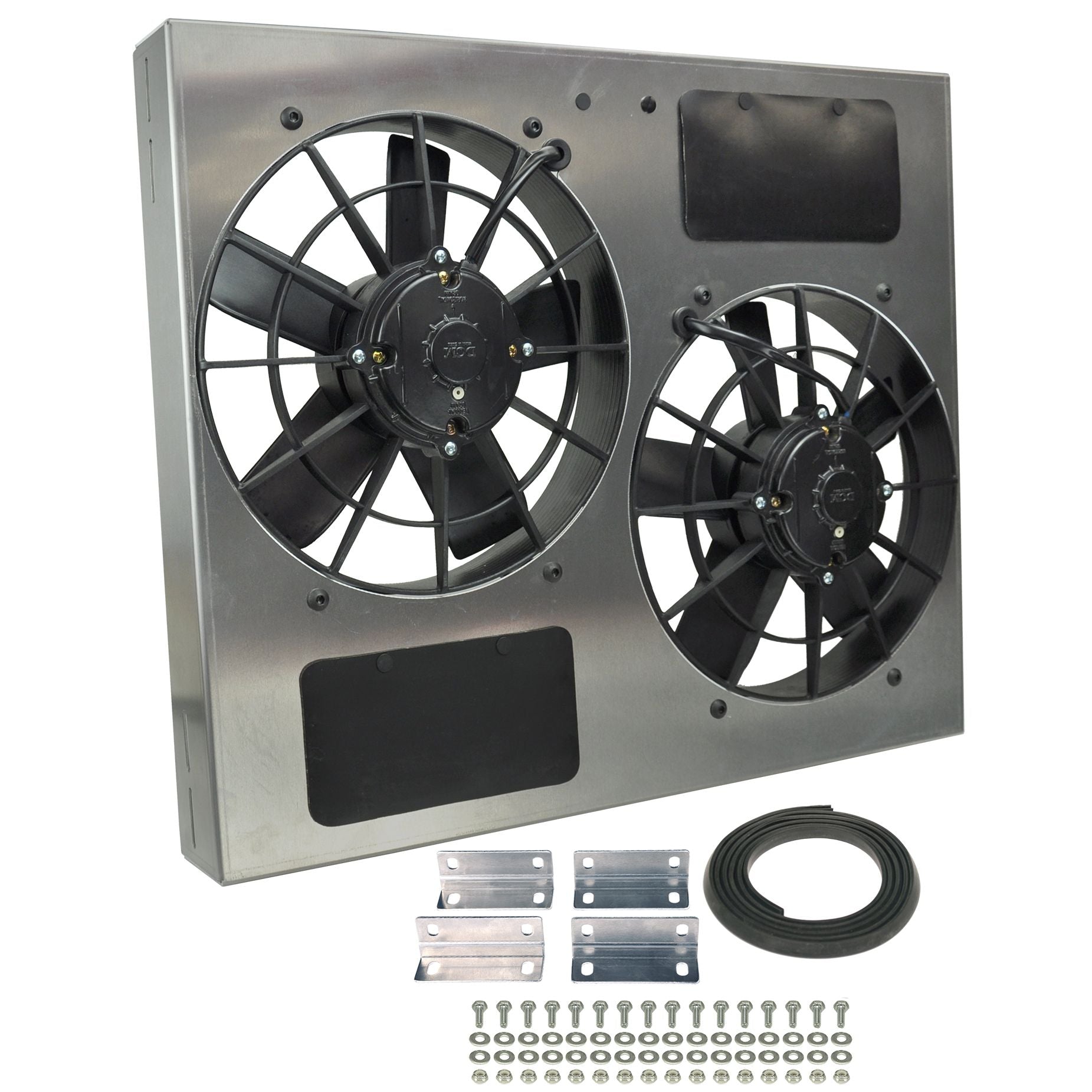 This Dual High Output RAD Fan Powerpack Assembly allows true Dual Fan performance in a package the size of others Single shrouded fans. Featuring an aluminum shroud measuring a tidy 23 3/4" wide by 19 3/4" top to bottom and only 4 1/2" in overall depth to offer an adjustable yet precision fit, it uses two IP-68 certified waterproof/dustproof 11" electric fans to provide a powerful one-two 3750 cfm punch to a hot engine. The natural, non-finished aluminum shroud gives the user the freedom to polish, anodize, paint, or simply leave it raw to create a truly custom look at a reasonable price.