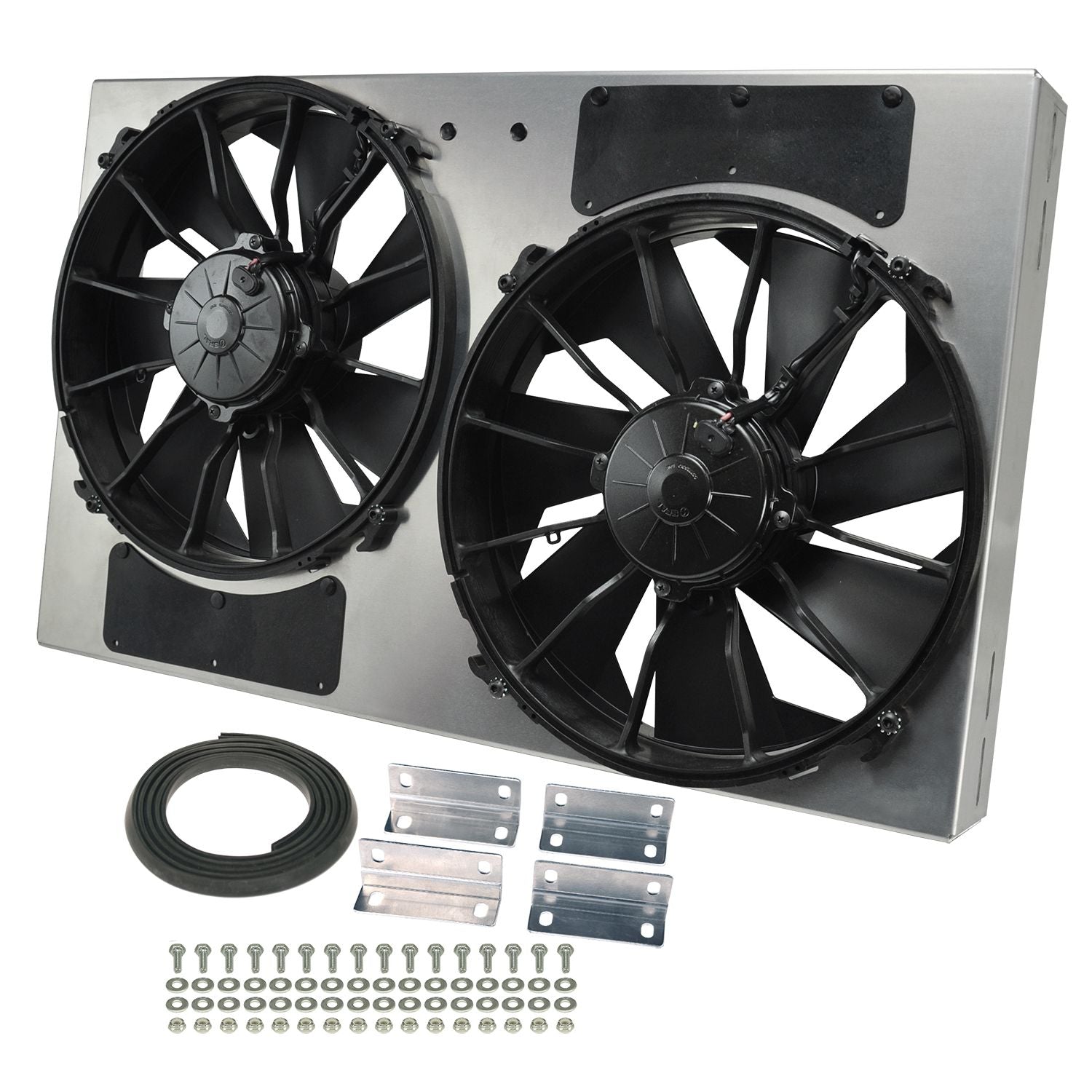 This Dual High Output RAD Fan Powerpack Assembly is part of the HO Aluminum Shrouded Fan Series that is designed with the application in mind. Based on some of the most common radiator core sizes sold today, this unit features an aluminum shroud measuring 26 3/8" wide by 16" top to bottom and is only 4" in overall depth to offer an adjustable yet precision fit. The natural, non-finished aluminum shroud gives the user the freedom to polish, anodize, paint, or simply leave it raw to create a truly custom look for an affordable price. The dual 12" high output electric fans are some of the most proven and reliable fans in our line-up. Offering a total of 4000 CFM, this dual electric fan assembly generates the most real-world airflow in the smallest package on the market.