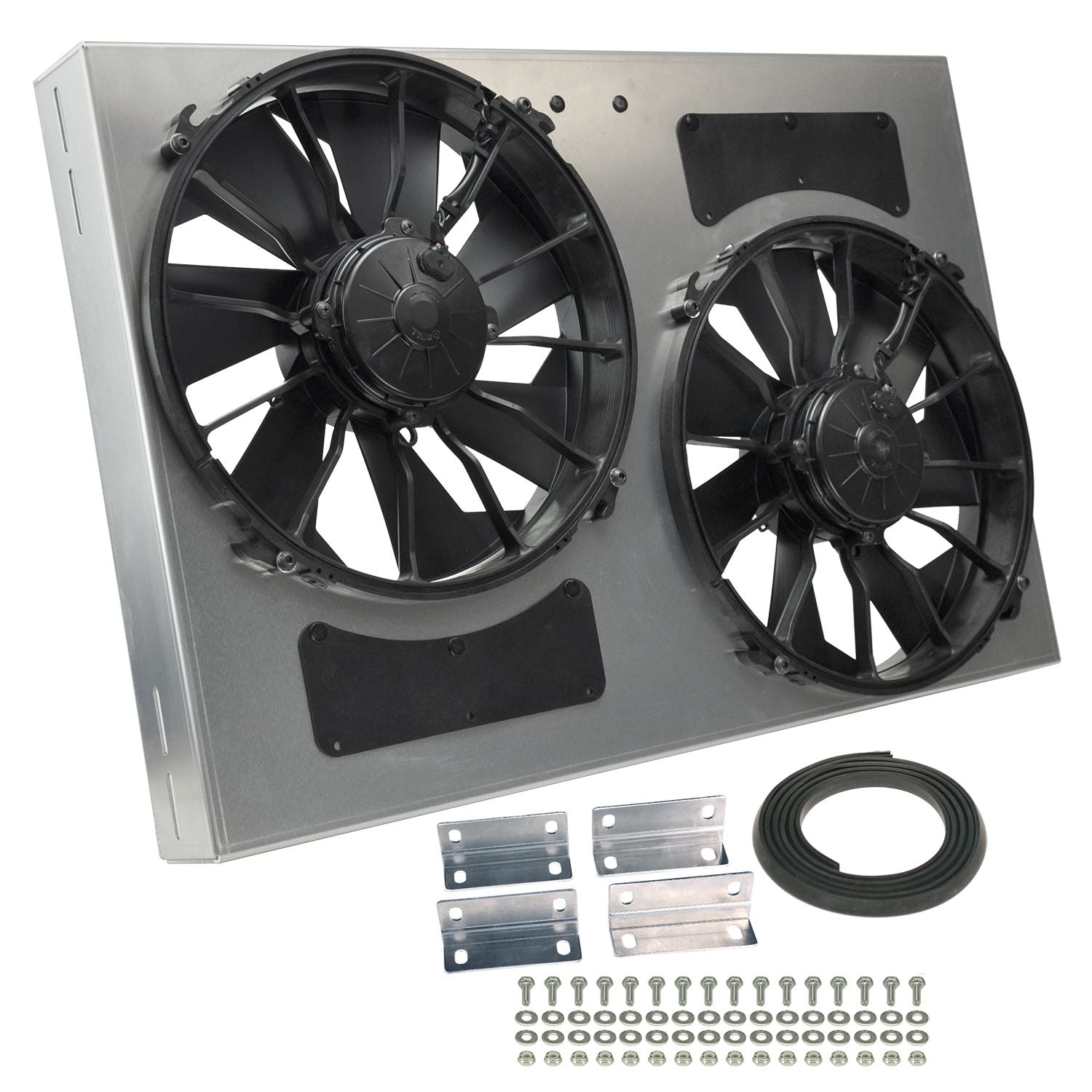 This Dual High Output RAD Fan Powerpack Assembly is part of the HO Aluminum Shrouded Fan Series that is designed with the application in mind. Based on some of the most common radiator core sizes sold today, this unit features an aluminum shroud measuring 27" wide by 18" top to bottom and is only 4" in overall depth to offer an adjustable yet precision fit. The natural, non-finished aluminum shroud gives the user the freedom to polish, anodize, paint, or simply leave it raw to create a truly custom look for an affordable price. The dual 12" high output electric fans are some of the most proven and reliable fans in our line-up. Offering a total of 4000 CFM, this dual electric fan assembly generates the most real-world airflow in the smallest package on the market.