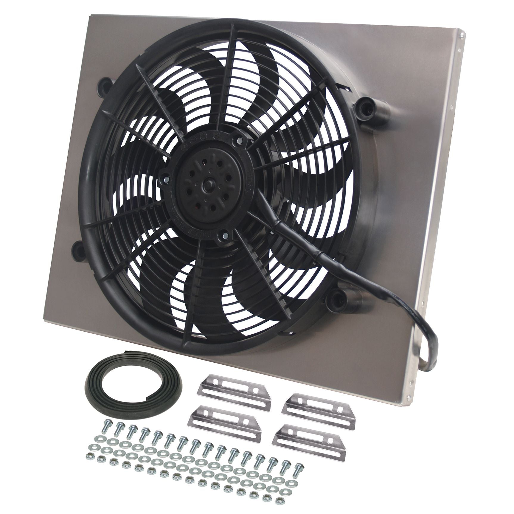 This High Output Single RAD Fan Powerpack is part of the HO Aluminum Shrouded Fan Series designed with popular applications in mind. This assembly measures 22 1/4" wide by 17 5/8" top to bottom and only 3" thick overall to offer an adjustable yet precision fit. The raw aluminum shroud gives the user the freedom to polish, anodize, paint, or simply leave it natural to create a truly custom look for an affordable price. The 17" high output two speed fan is one of the best in our line-up offering 2400 CFM when on high to create the most airflow possible in a compact size.