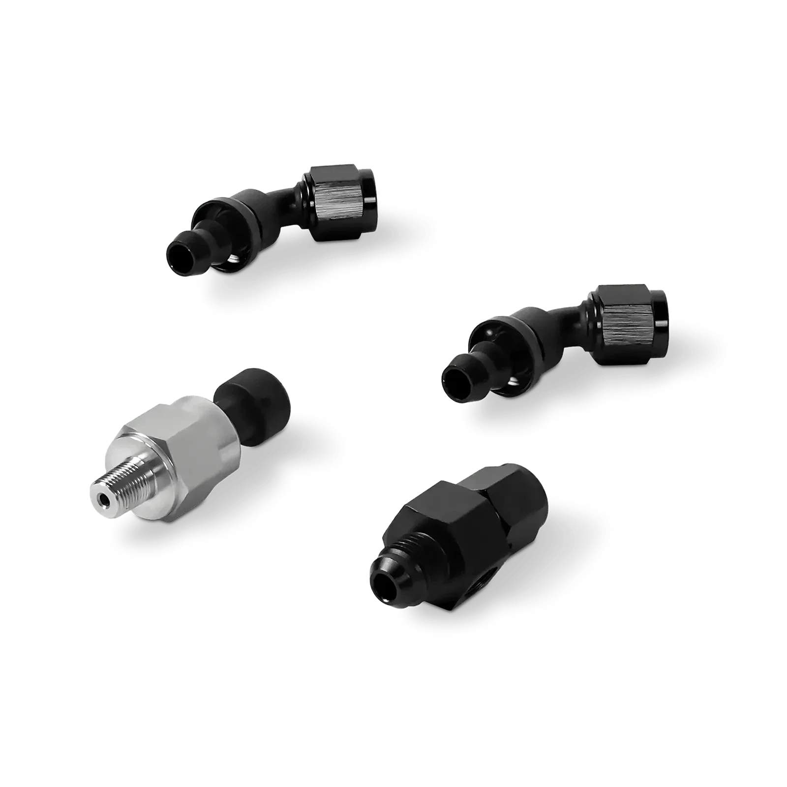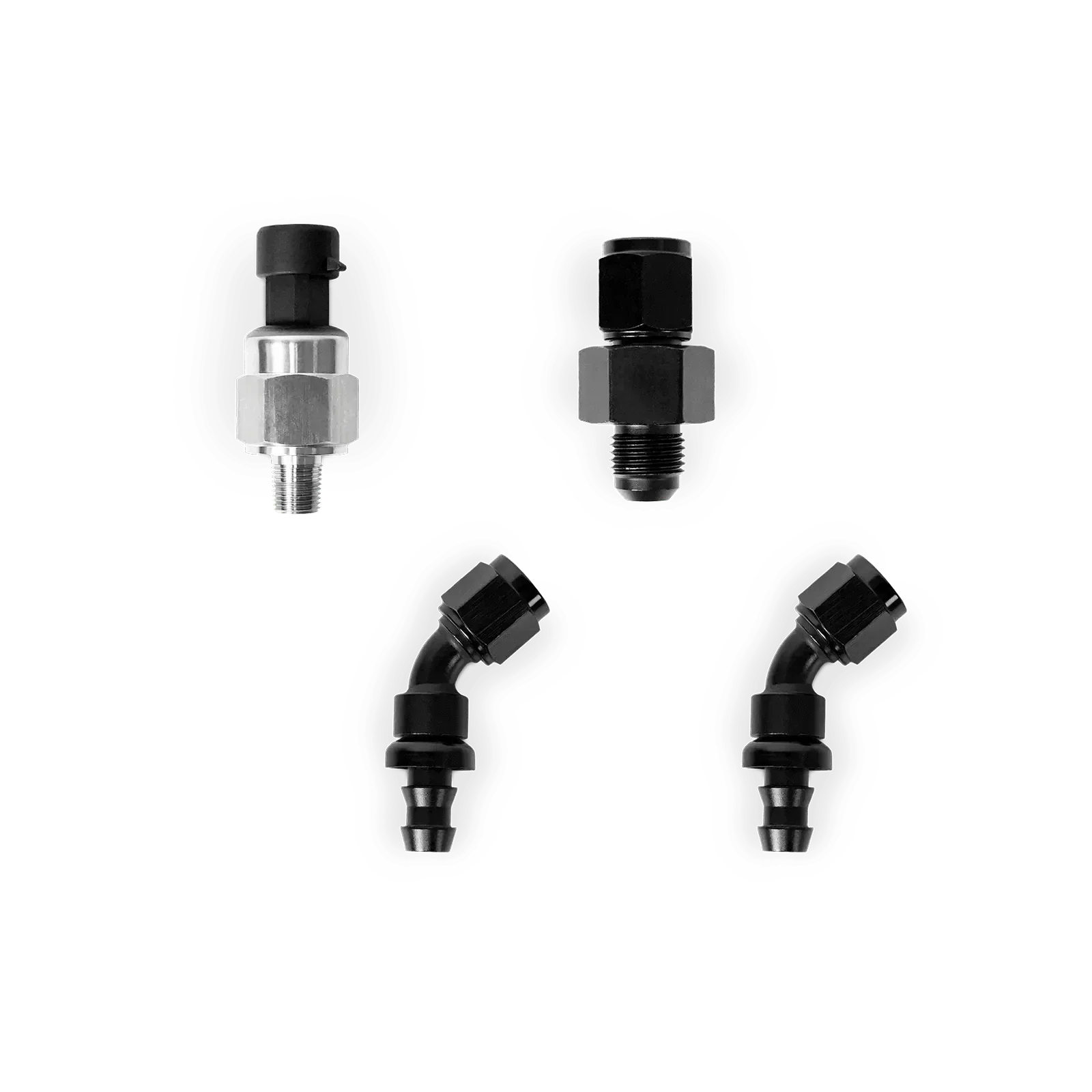 Aces EFI pressure sensor kits utilize top-quality parts for use with EFI systems. Kits include plastic/steel sensors with 1/8" -27 NPT threads and include a -6 AN fuel pressure take-off adapter fitting and 2 sets of 45 push lock hose ends.
