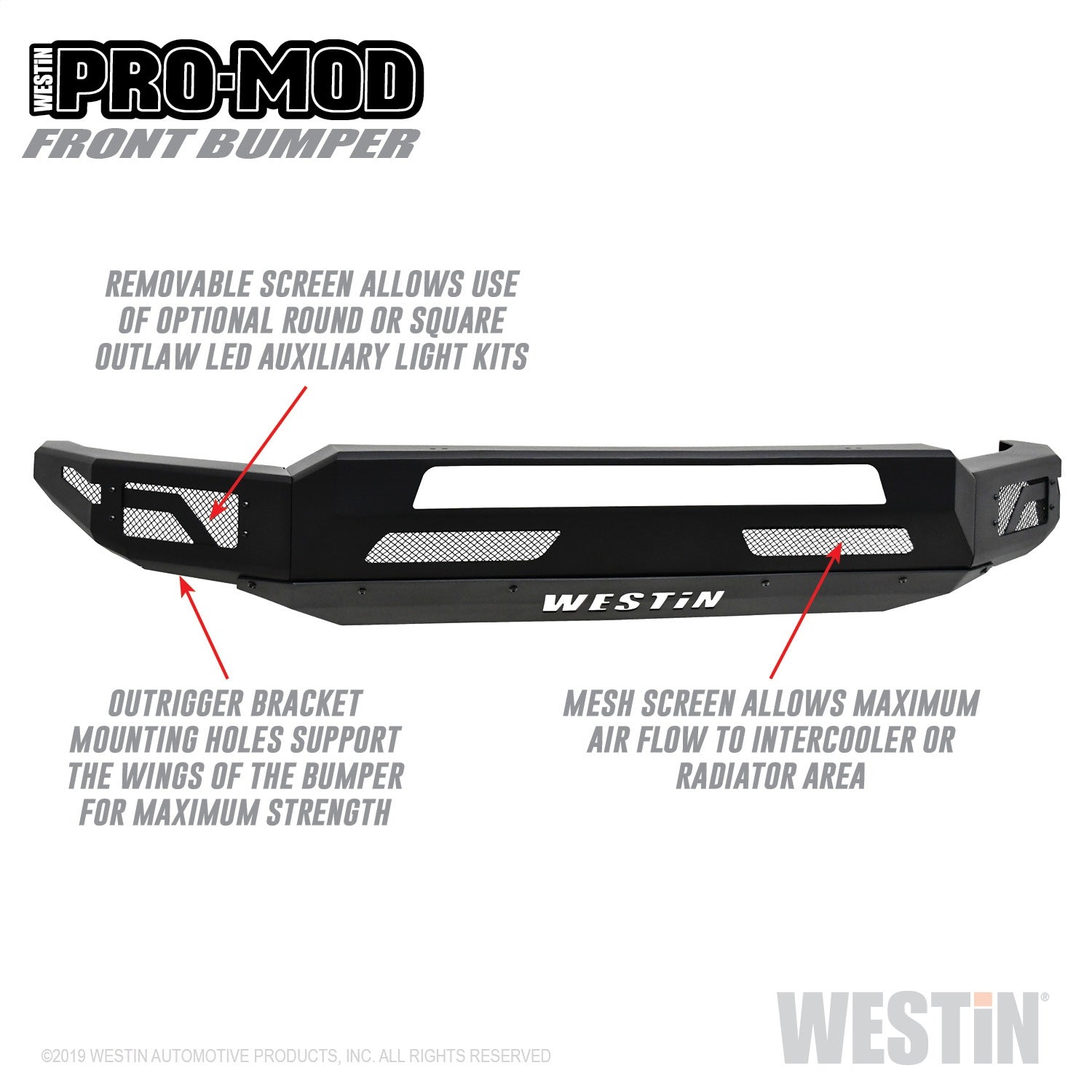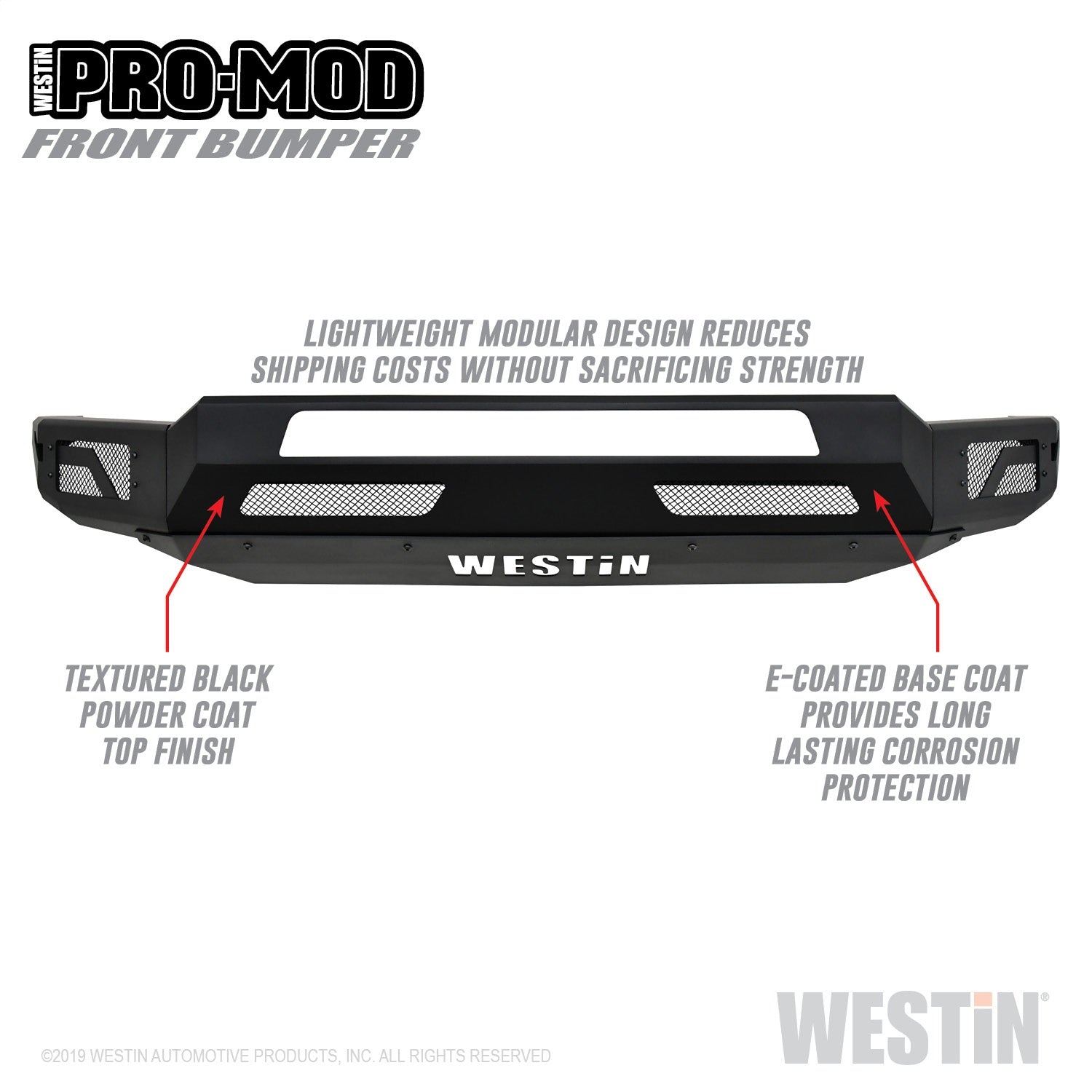 Westins Pro-Mod Front Bumper combines enhanced vehicle protection, with great looks. Pro-Mods revolutionary lightweight modular design is uniquely engineered with outrigger reinforcement brackets to provide maximum front end protection without compromising on strength, integrity or durability. The "high and tight" bumper profile creates a greater approach angle, which significantly improves off-road driving capabilities. The lightweight design also requires smaller shipping packages which dramatically reduces shipping costs. Pro-Mod bumpers feature a textured black finish with an e-coated base coat, providing long lasting corrosion protection from the elements. Once you see the Pro-Mod Front Bumper, the choice becomes obvious.