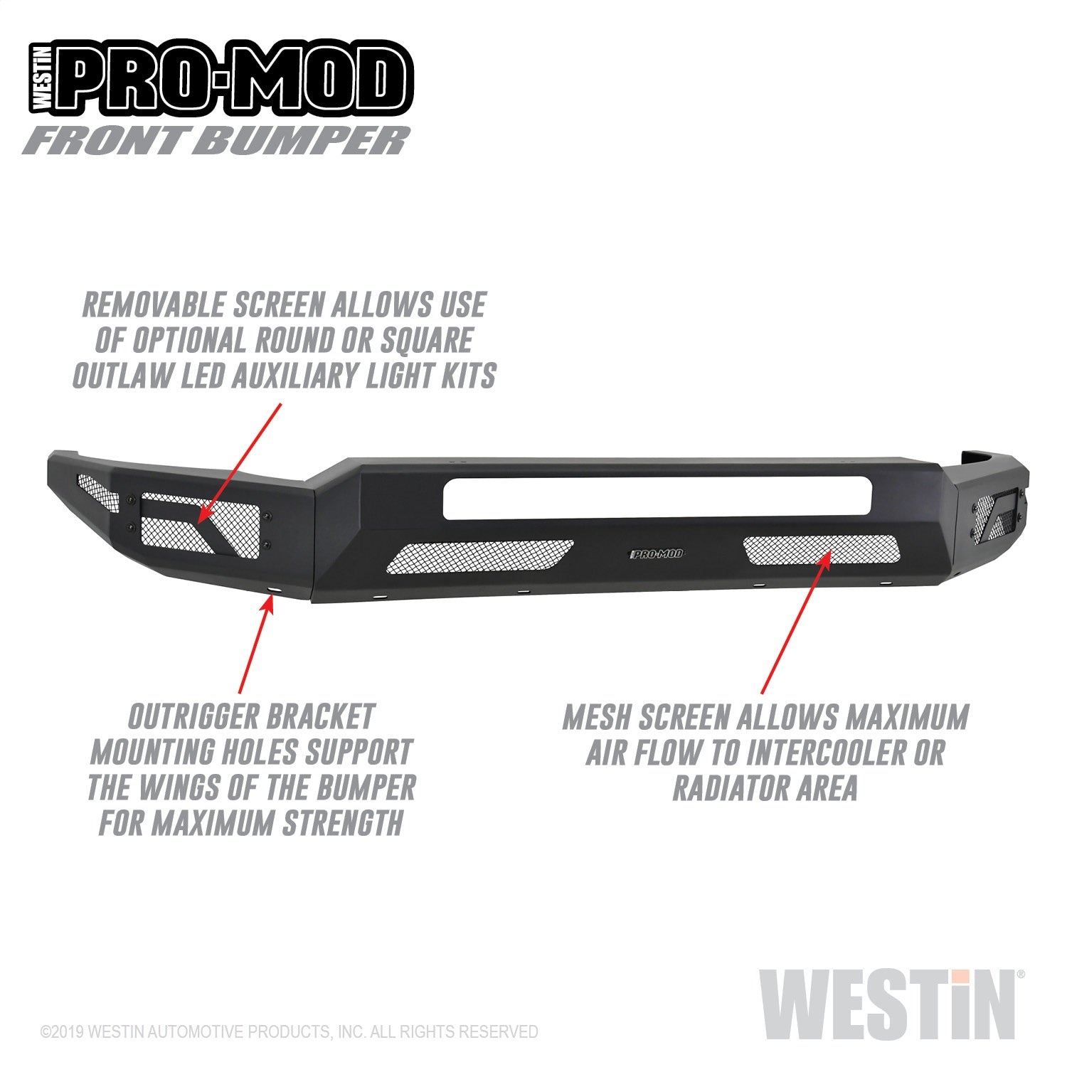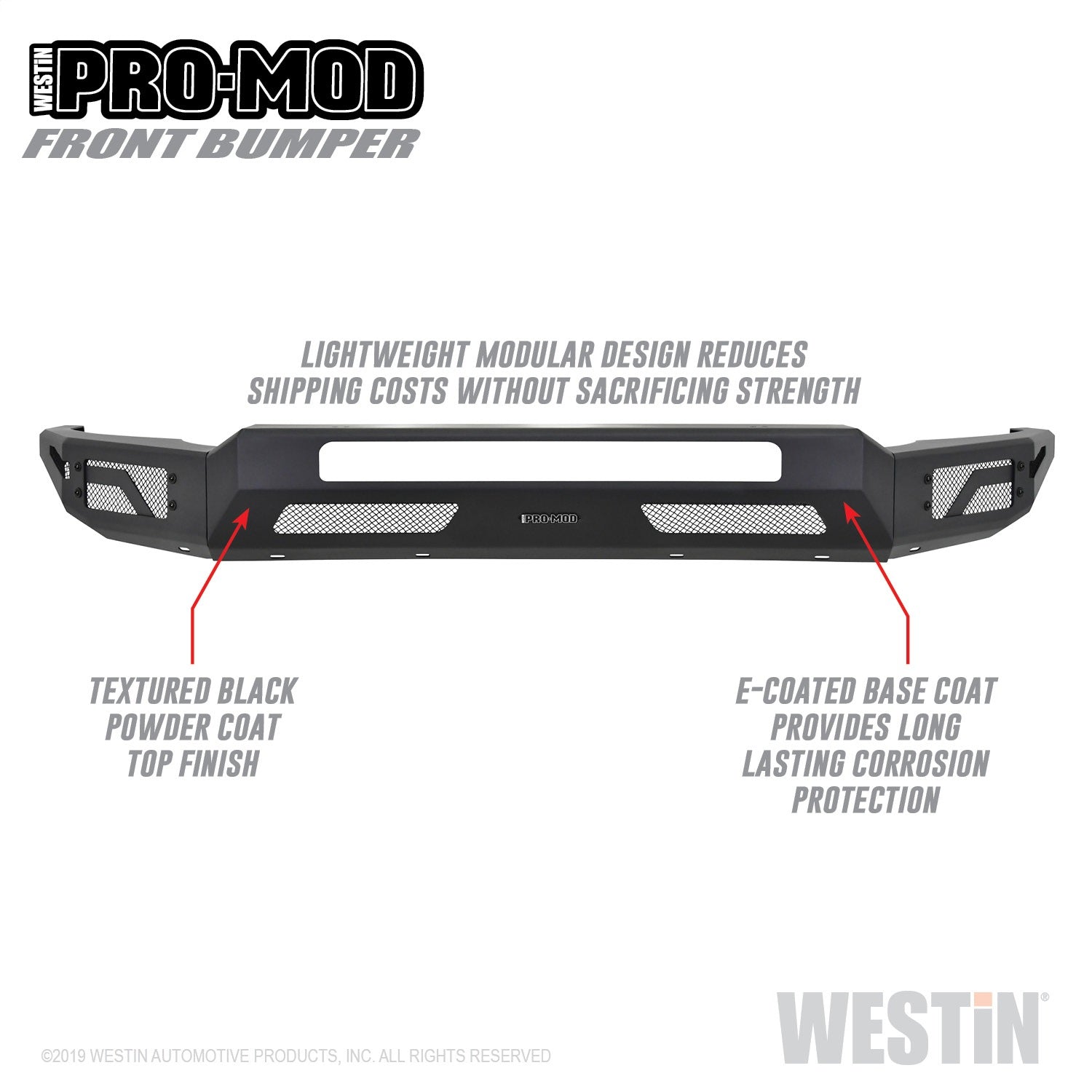 Westins Pro-Mod Front Bumper combines enhanced vehicle protection, with great looks. Pro-Mods revolutionary lightweight modular design is uniquely engineered with outrigger reinforcement brackets to provide maximum front end protection without compromising on strength, integrity or durability. The "high and tight" bumper profile creates a greater approach angle, which significantly improves off-road driving capabilities. The lightweight design also requires smaller shipping packages which dramatically reduces shipping costs. Pro-Mod bumpers feature a textured black finish with an e-coated base coat, providing long lasting corrosion protection from the elements. Once you see the Pro-Mod Front Bumper, the choice becomes obvious.
