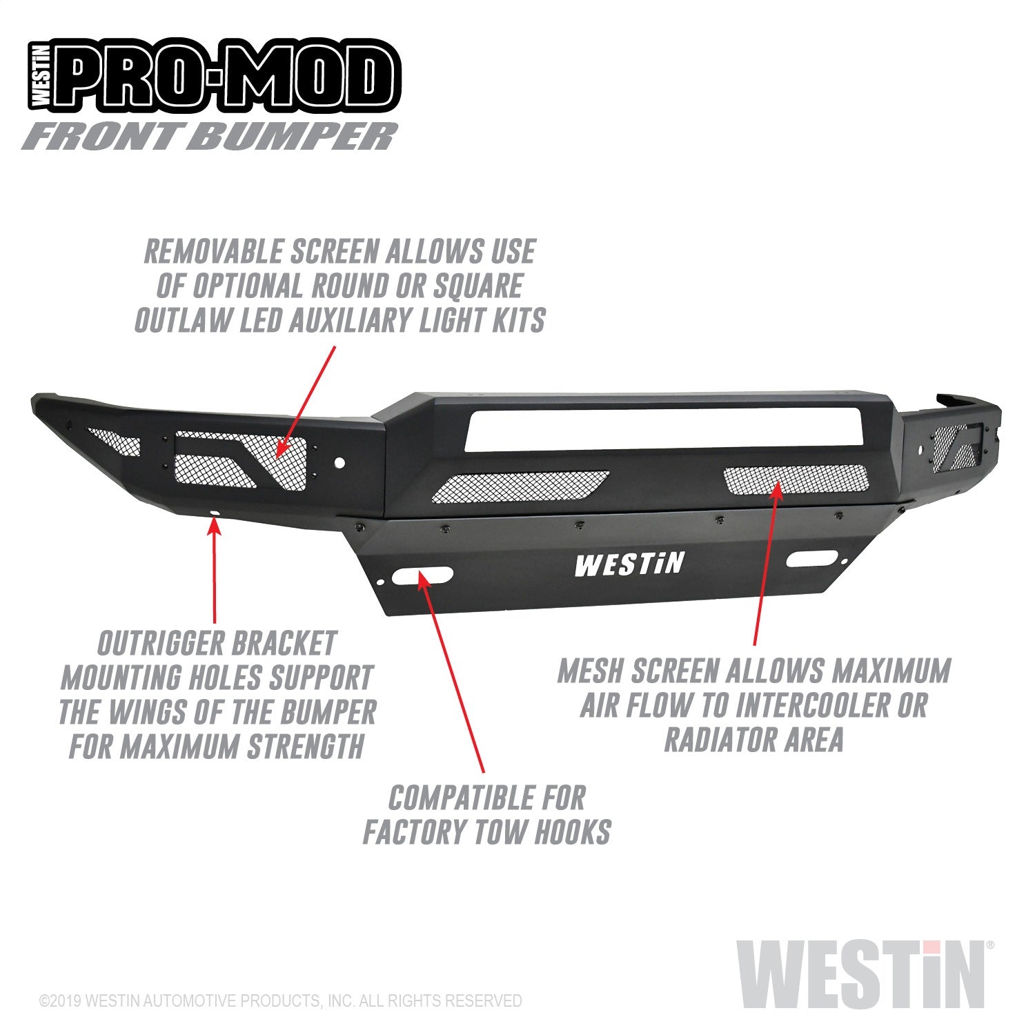 Westins Pro-Mod Front Bumper combines enhanced vehicle protection, with great looks. Pro-Mods revolutionary lightweight modular design is uniquely engineered with outrigger reinforcement brackets to provide maximum front end protection without compromising on strength, integrity or durability. The "high and tight" bumper profile creates a greater approach angle, which significantly improves off-road driving capabilities. The lightweight design also requires smaller shipping packages which dramatically reduces shipping costs. Pro-Mod bumpers feature a textured black finish with an e-coated base coat, providing long lasting corrosion protection from the elements. Once you see the Pro-Mod Front Bumper, the choice becomes obvious.