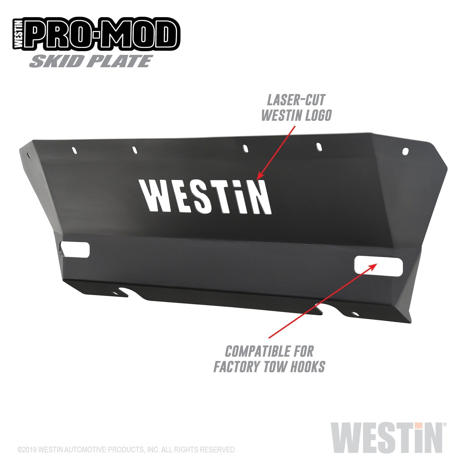 Westin's Pro-Mod Skid Plate is constructed of durable 10 gauge steel to protect your vehicle from damage caused by road debris. It mounts directly to the frame and includes a laser-cut Westin logo. Offers bolt-on installation so no drilling is required. Hardware and mounting brackets included.