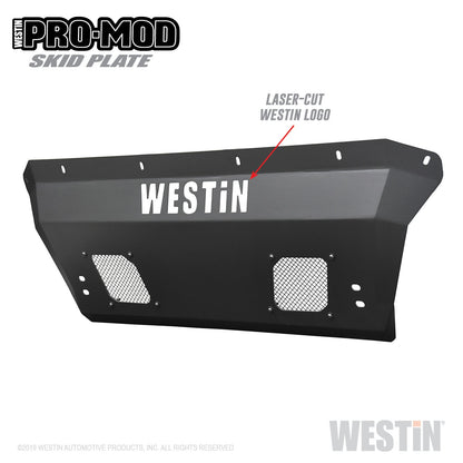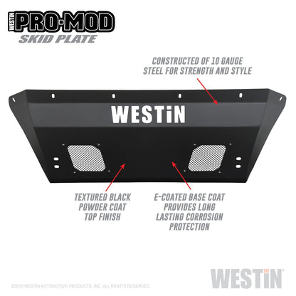 Westin's Pro-Mod Skid Plate is constructed of durable 10 gauge steel to protect your vehicle from damage caused by road debris. It mounts directly to the frame and includes a laser-cut Westin logo. Offers bolt-on installation so no drilling is required. Hardware and mounting brackets included.