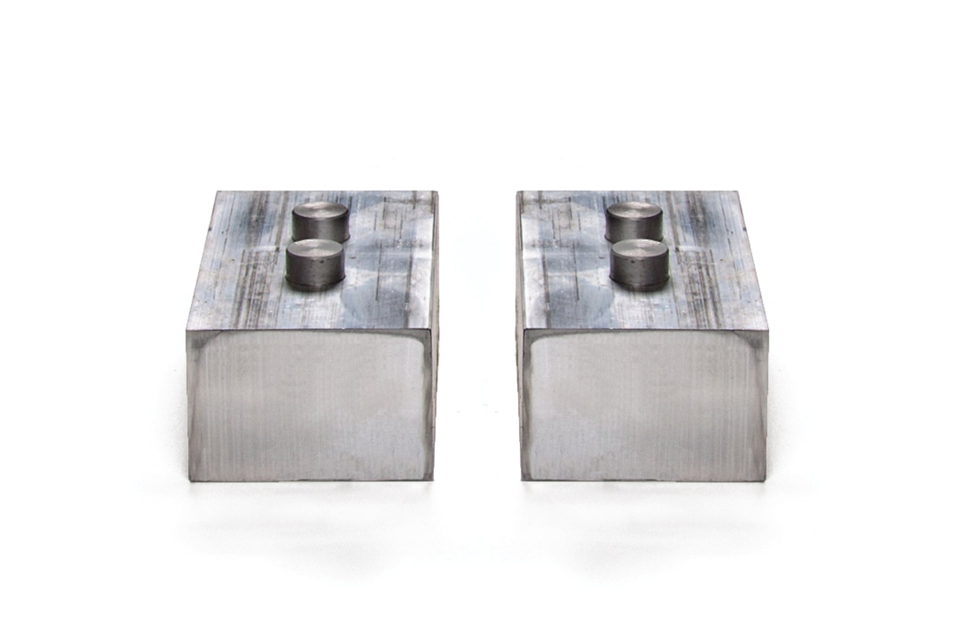 Upgrade your trucks rear suspension with premium billet aluminum lift blocks. These high quality 2 inch lift blocks are specially designed to lift the rear of leaf spring trucks. They come finished in a black e-coating and use a tapered design to help improve pinion angle once installed. Uses Dual pin design. Sold in pairs.