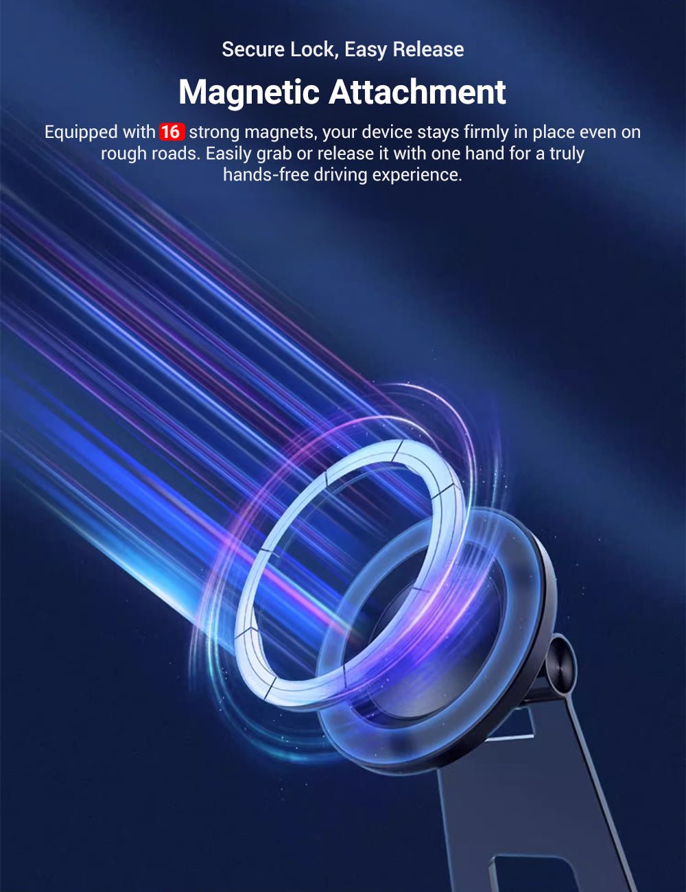 Secure and Magnetic Hold: Our Car Holder features a strong magnetic grip, keeping your tablets or smartphones securely in place, even on bumpy roads. Say goodbye to slipping devices and distractions.