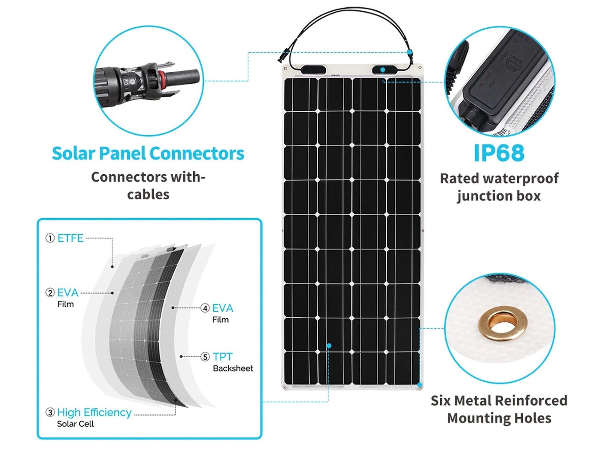 This 100W Renogy panel is super lightweight and consumes practically no space in your van while stowed beneath the rear cushion over the engine bay. It measures 48"x21.6" and less than 0.1" thick, weighing only 4.2 lb. If you're more concerned about stability in windy conditions or want a more rugged, rigid panel, consider Renogy's 100W suitcase-style panel.