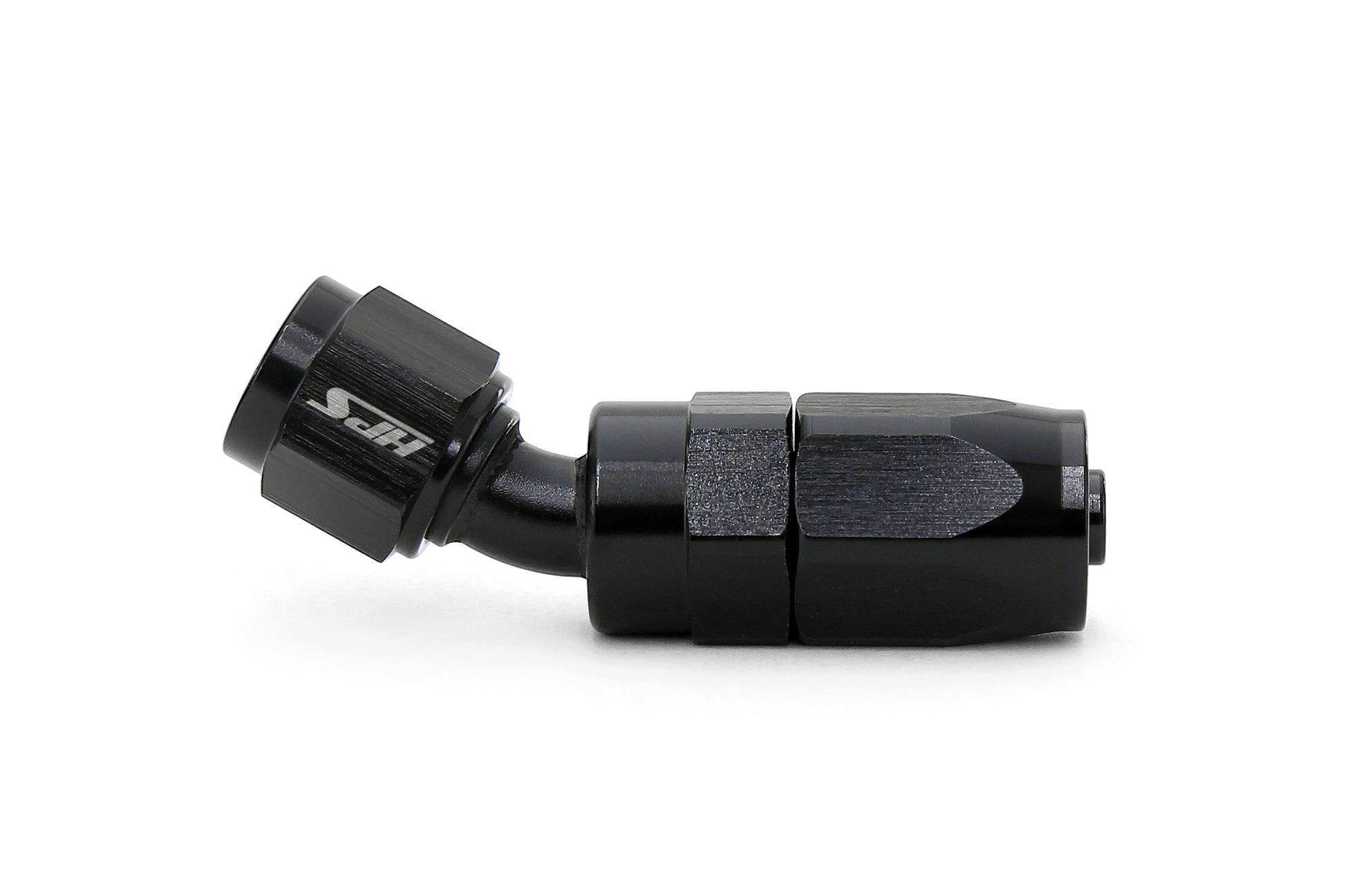 HPS 250 Series Hose End Fittings are designed to fit HPS 250 Series Rubber Flex Hoses. This reusable fitting uses a compression style design that does not cut the hose and is easier to assemble than cutter style fittings. It also features a double swivel design, allowing for unrestricted movement during installation in order to prevent undesired twisting, kinking, and bending. HPS 250 Series 6061 grade aluminum fittings come in Type II anodized black for a clean appearance that is corrosion and scuff resistant.