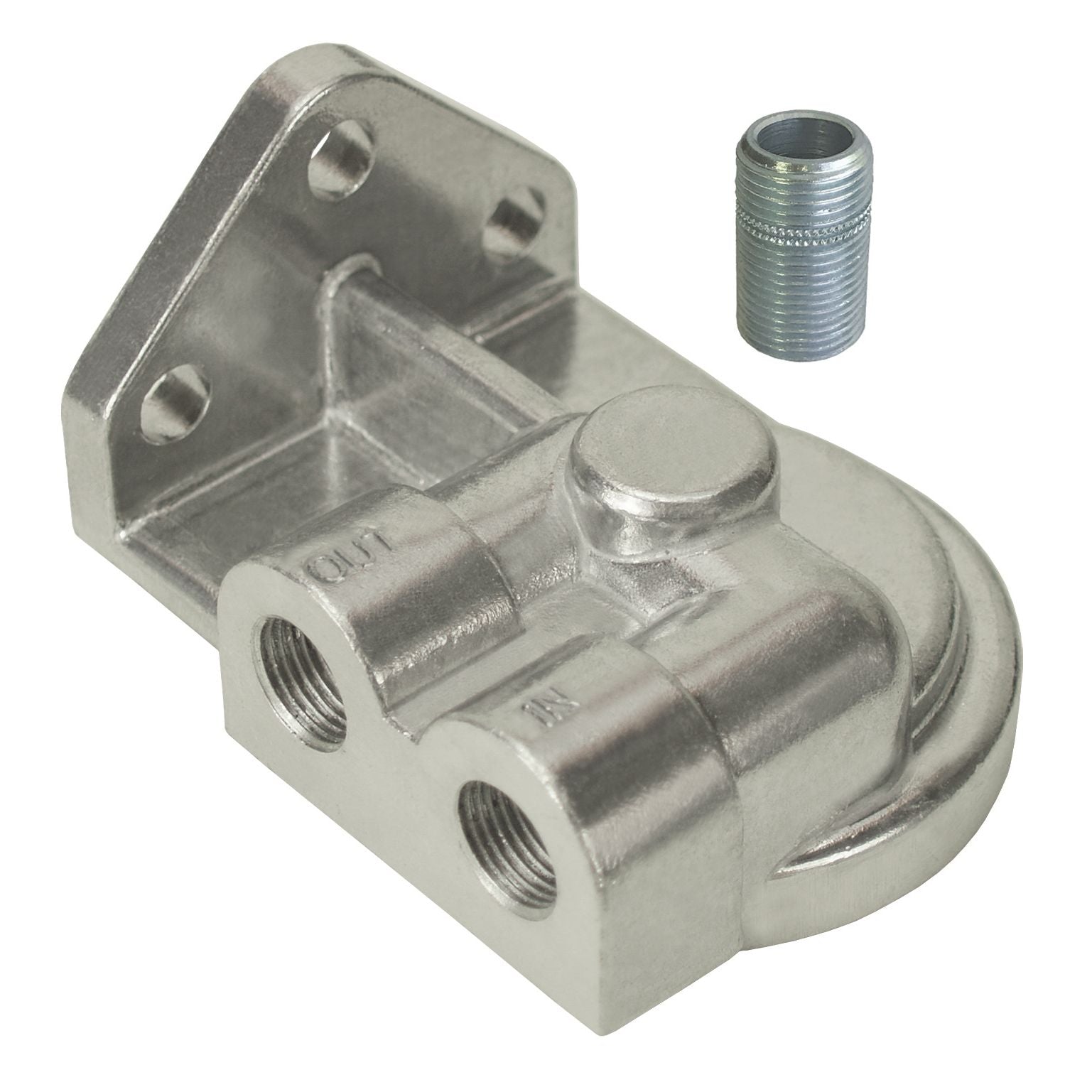 This new single remote filter mount is cast from high quality aluminum and features left only 3/8" NPT inlet and outlet ports and includes a 3/4"-16 threaded filter nipple.