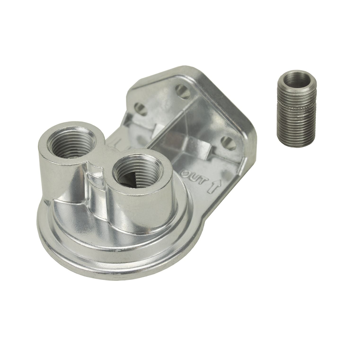 High quality aluminum die cast remote single ports up mount with 13/16"-16 filter threads and 1/2" NPT inlet & outlet ports allows for remounting filter for easy access to make messy filter changes under the vehicle a thing of the past. Kit includes threaded filter nipple. Comes with bright finish.