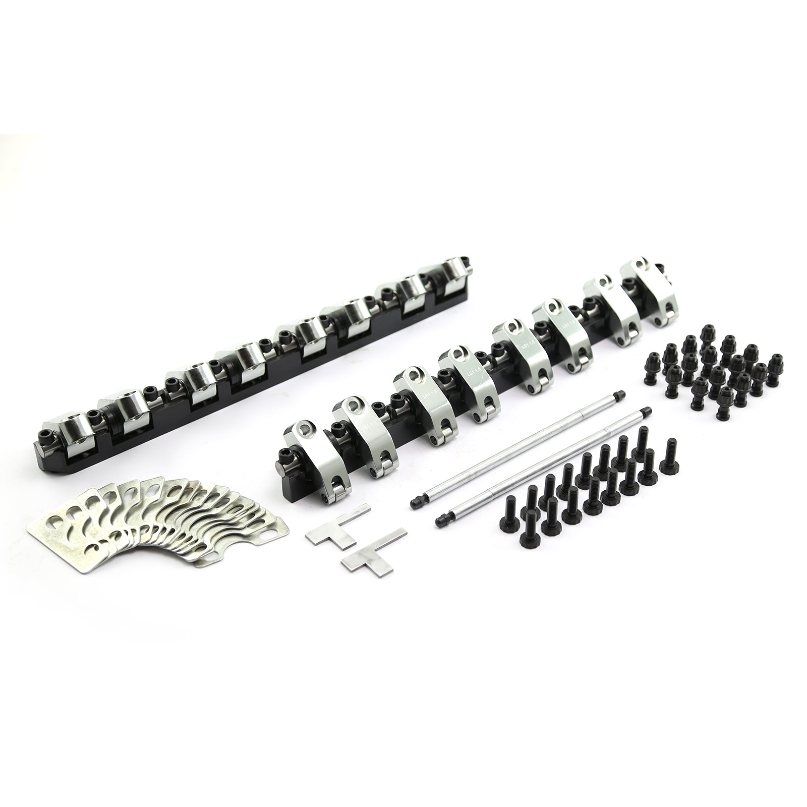 PCE extruded aluminum and stainless steel shaft mount rocker system includes steel shafts with pedestals. All rockers feature large needle bearings and roller tips. For extreme high performance applications. They not only unleash horsepower, but they also lengthen valvetrain component life and reduce wear and tear on valve stem tips. These rockers are precision-machined to ensure consistency and ratio accuracy and have a great looking finish.Our PCE aluminum rocker arms are made from 6061-T6 or Series 7000 2024 aircraft quality aluminum alloy extrusions. Each rocker body is relieved for extra valve spring clearance and anodized for added strength. CNC machined billet steel pedestals, ground steel alloy rocker shafts, alloy steel fasteners, and needle roller bearings from the finest manufacturers in the world comprise the foundation of these rocker arm systems. These complete kits include all the components and hardware required for a professional installation.