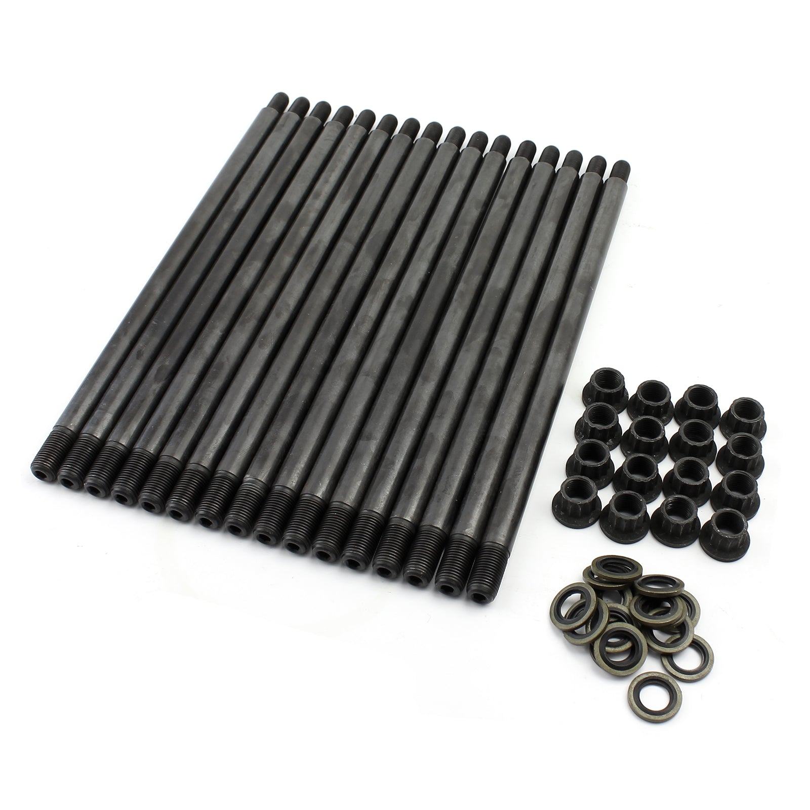 PCE RX7 rotary engine stud kit fits all 13b engines. Replaces 16 of the engine thru bolts to chromeoly steel with black oxide coating. Includes factory washers. Our engine fasteners are made from aircraft quality 8740 high tensile strength chromoly steel and cold-forged to ensure molecular integrity. They are heat-treated prior to thread rolling and machining and are rated at a whopping 190,000 psi. All kits come complete with 12 point nuts and hardened parallel washers for an even load distribution and accurate torque readings.The rear, center, and both rotor housings need to be drilled out with a 1/2" drill bit (not provided) to allow the oversize bolt to pass through.