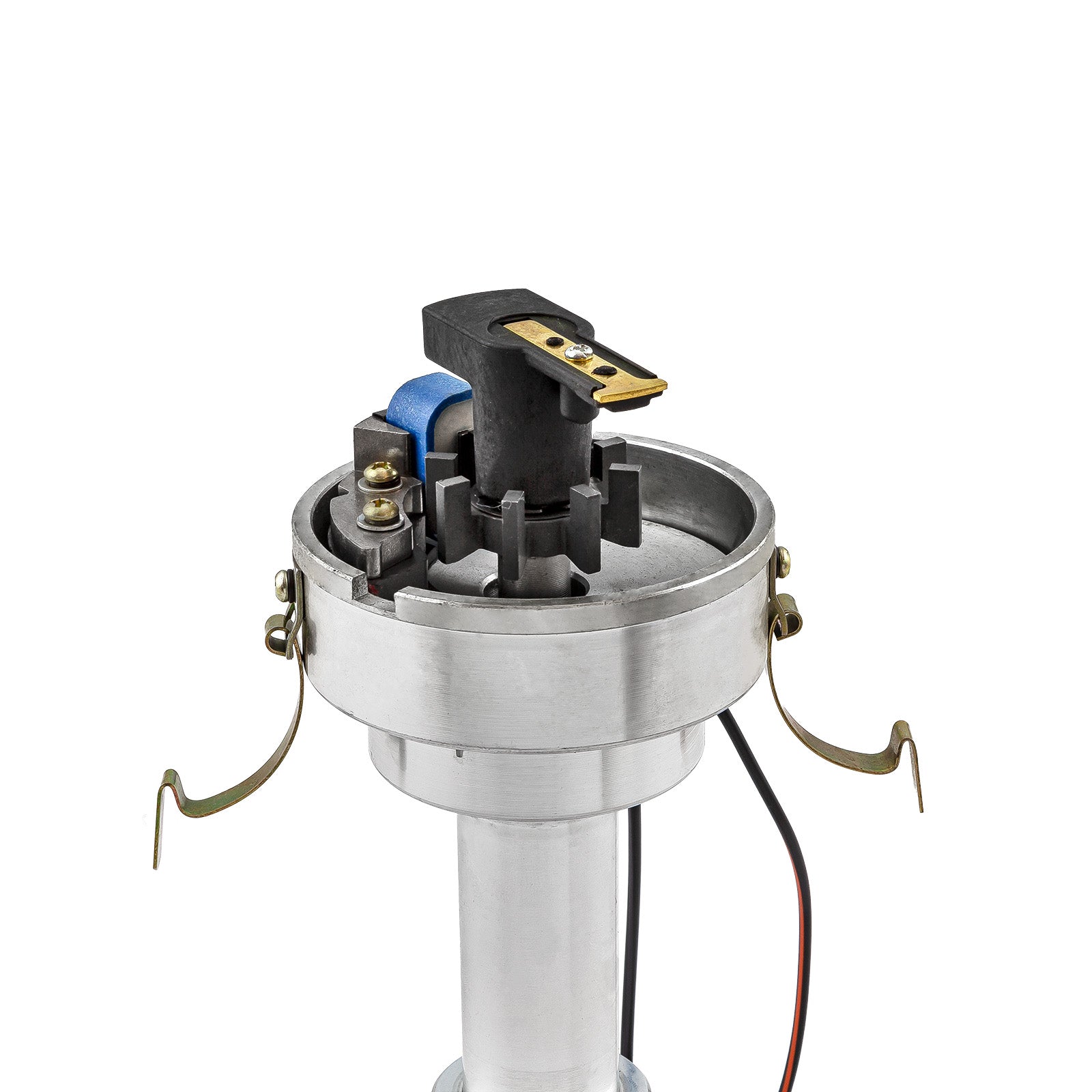 PCE 8000 Series billet distributors are designed for the enthusiast that is serious about performance but needs the small cap size due to space considerations when installed. They are precision CNC machined from billet 6061-T6 aluminum to exacting tolerances. The "spark plug" type terminals offer secure wire attachment. Under the brass terminals of the cap and rotor is an extremely accurate magnetic pickup that never requires adjustment along with an easy to adjust mechanical advance mechanism. The heavy duty 1/2" steel shaft is guided in a long sintered bushing as well as a sealed ball bearing at the top to precisely locate the reluctor. This combination yields stable timing and spark delivery at any RPM. Billet Housing: PCE Magneto Series feture a distributor housing machined from billet aluminum. PCE uses Computerised Numerical Controlled (CNC) mills and lathes to create each housing.