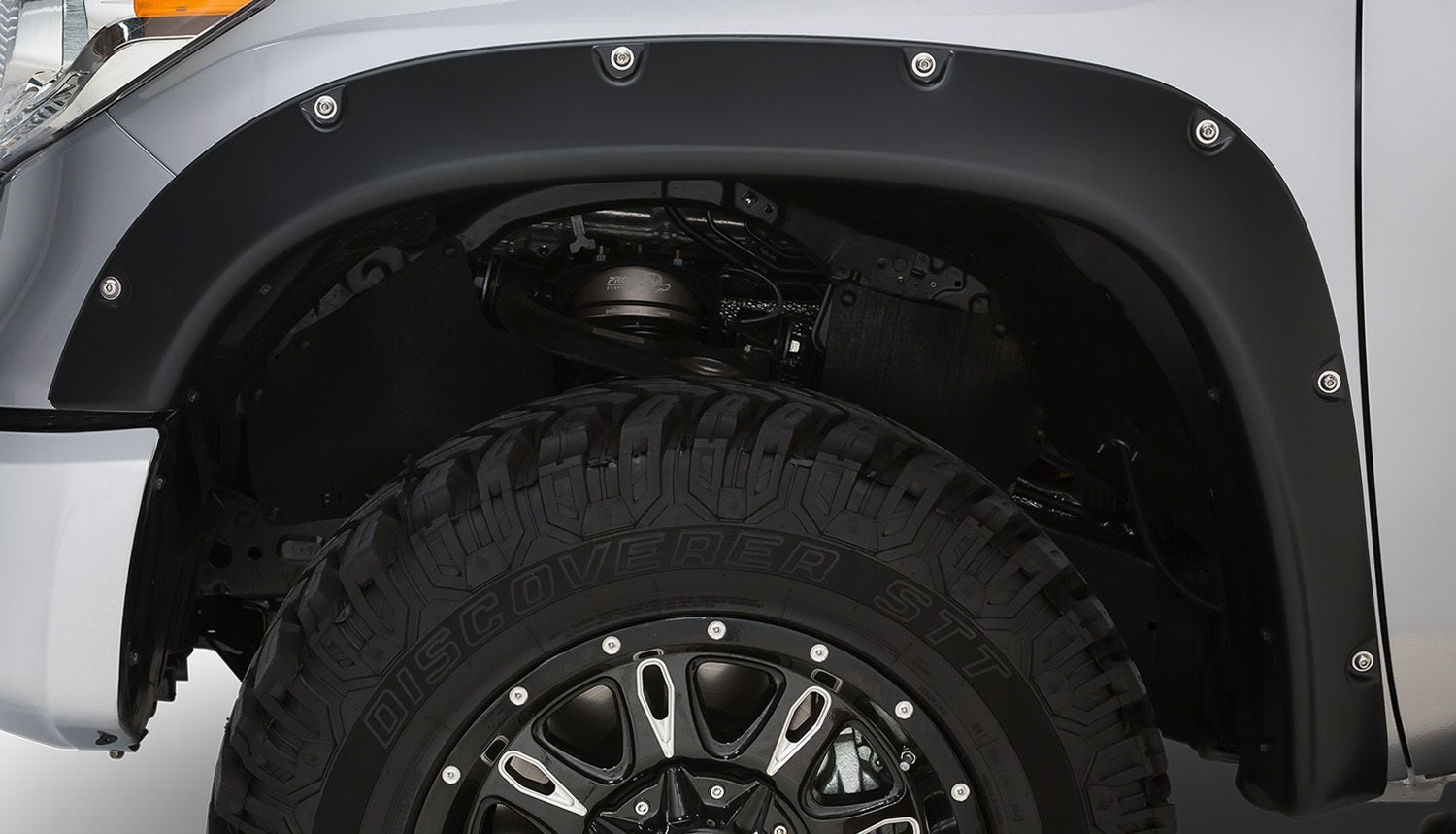 - Debossed pocket style fender flares with rivets give a bold look for your truck