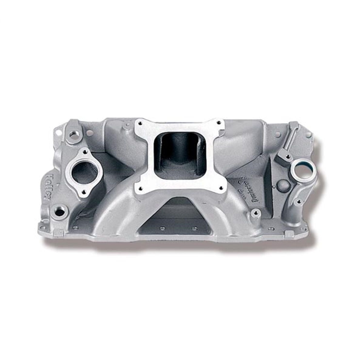 Strip Dominator intake manifold square bore carburetor mounting flange. Single plane with isolated plenum. Isolated water cross-over.