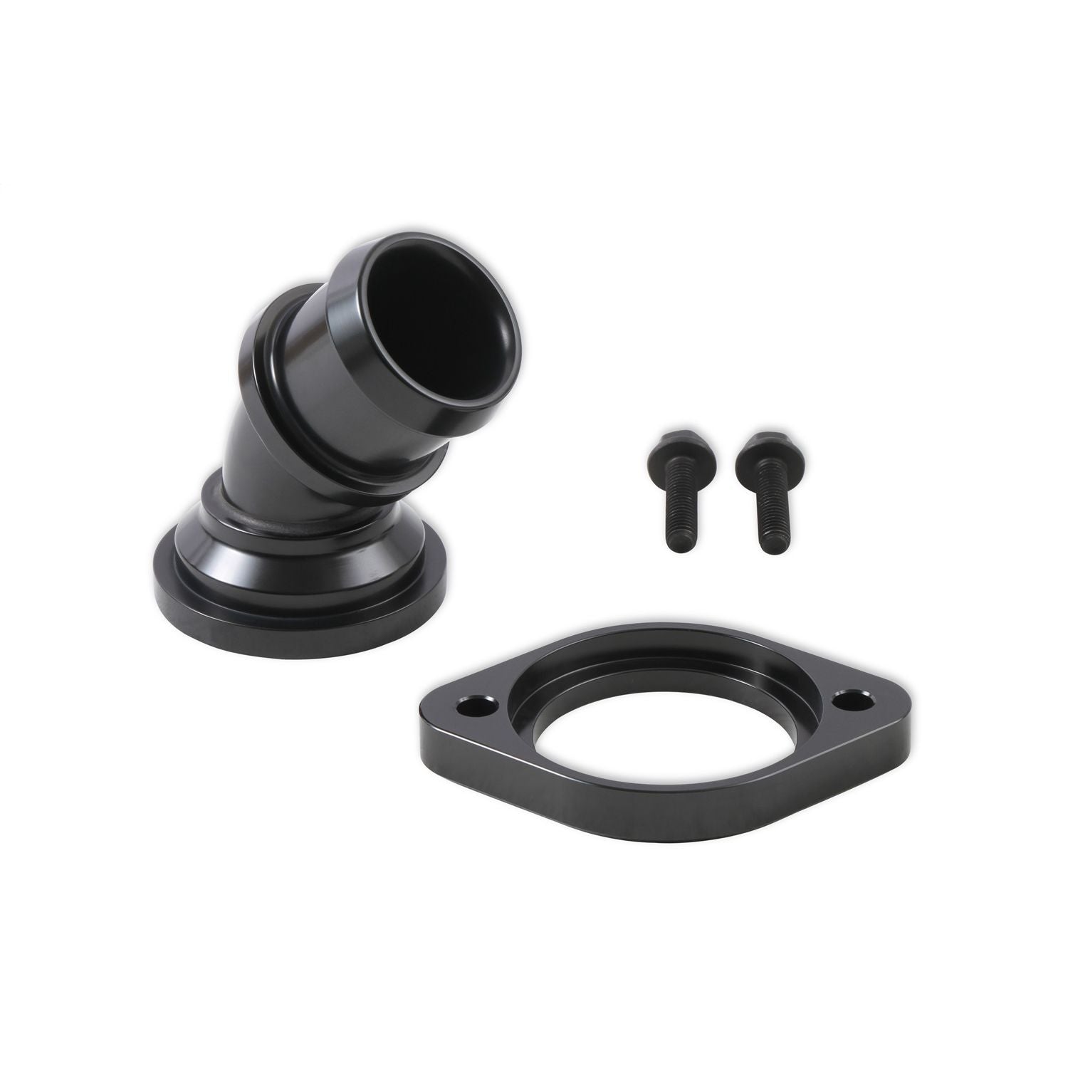These water necks fit Mopar Gen III Hemi engines, and are ideal for use in engine swaps since the swivel allows adjustment to accommodate custom radiator hoses. The billet aluminum with black anodized finish looks great and prevents corrosion. Choose from outlets with a 45 degree or 90 degree angle (both swivel 360 degrees before bolts are tightened up).