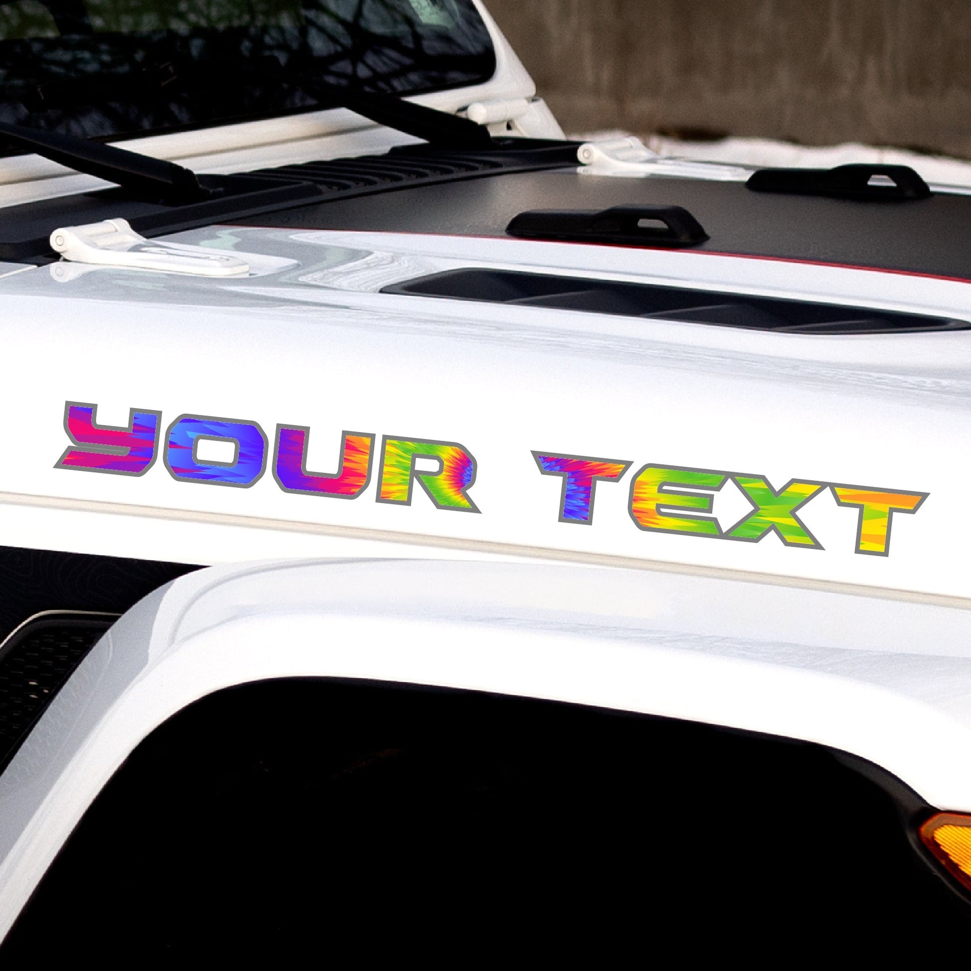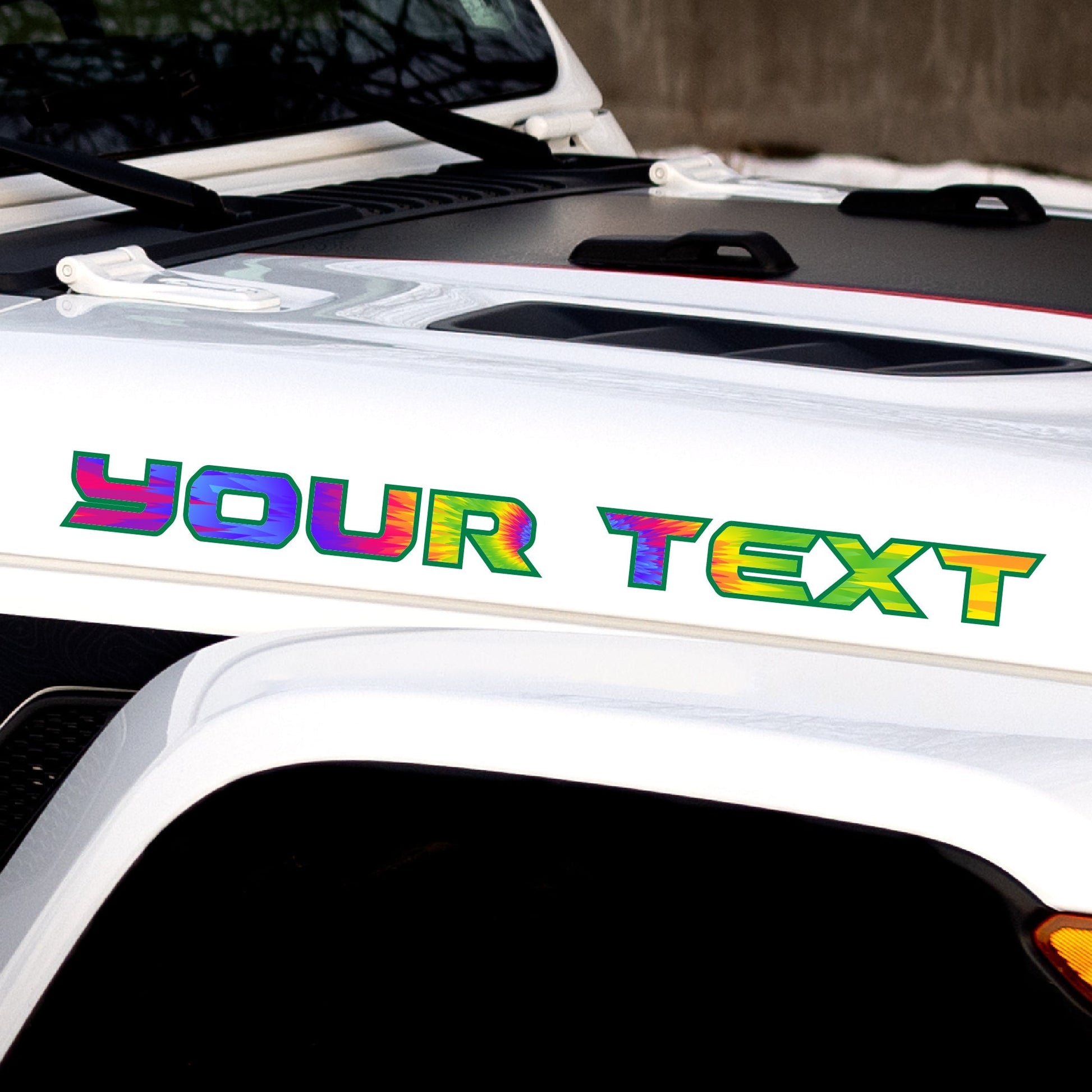 Includes: (2) Custom Text Decals, one for each side of the hood
