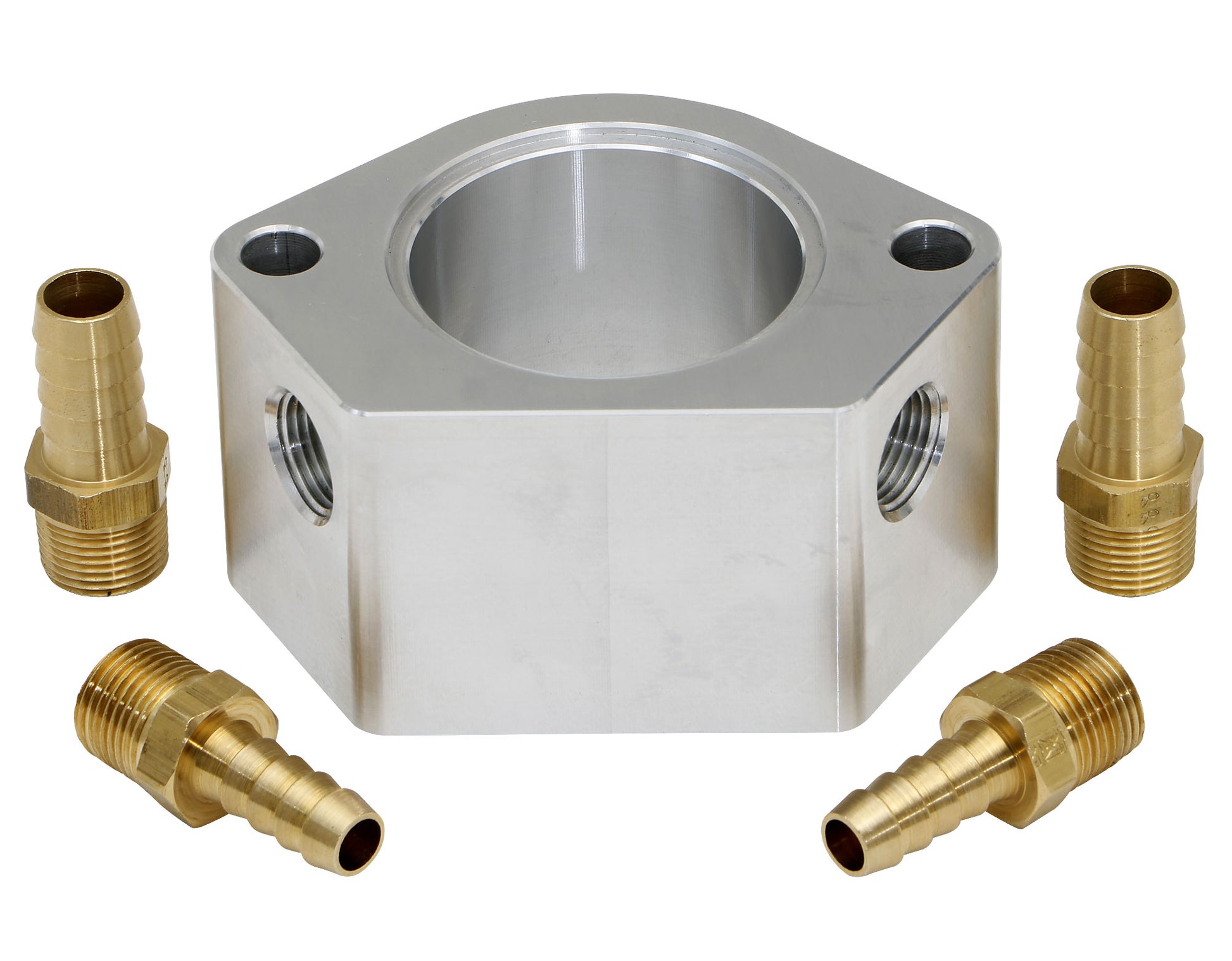 Trans-Dapt Performance 2 In. Tall Billet Aluminum Thermostat Housing Riser With Dual 3/8 In. Npt Water Ports; Fits 1955-99 Sb Chevy And 1966-90 Bb Chevy Engines- Clear Anodized 6105