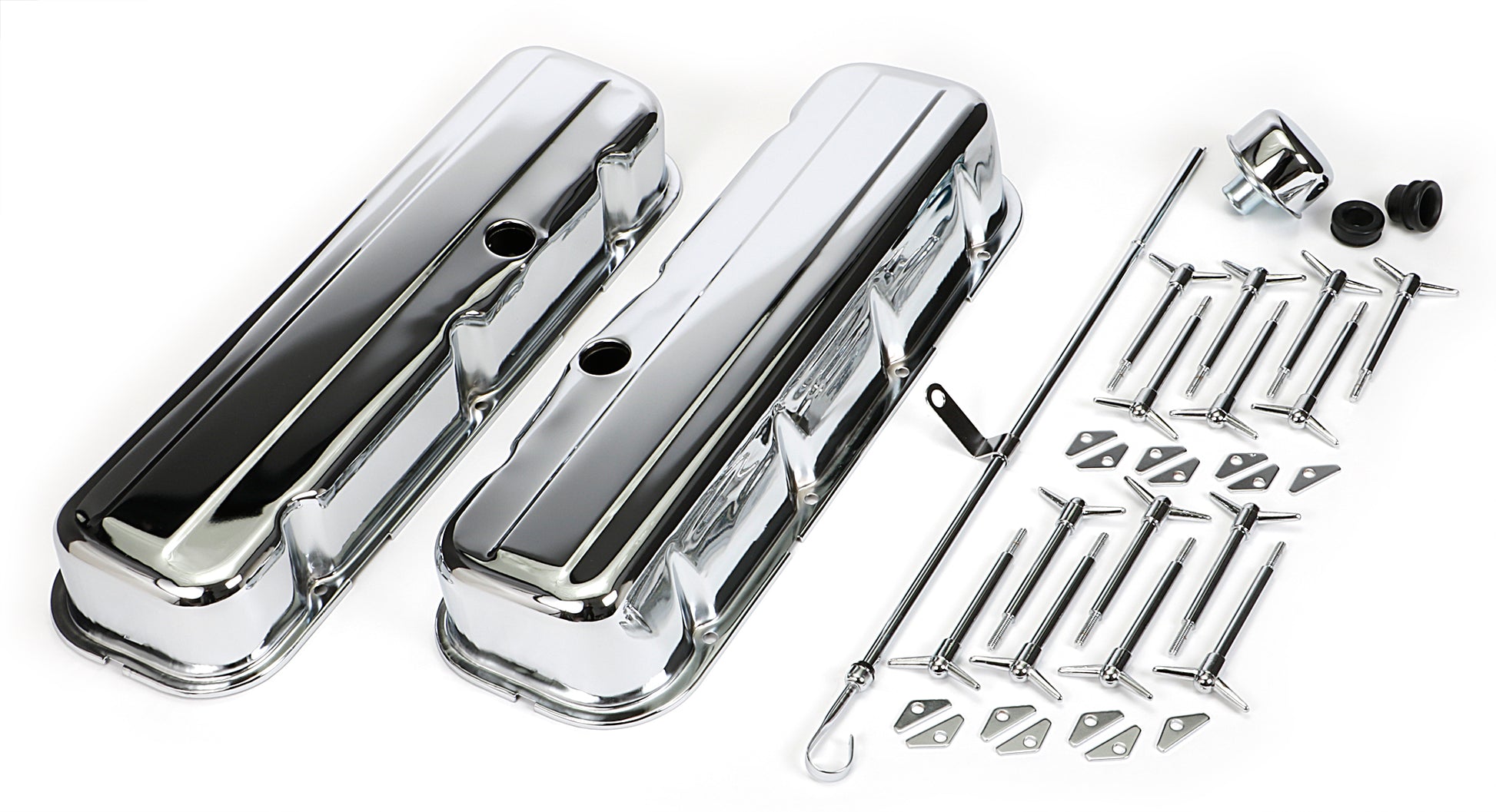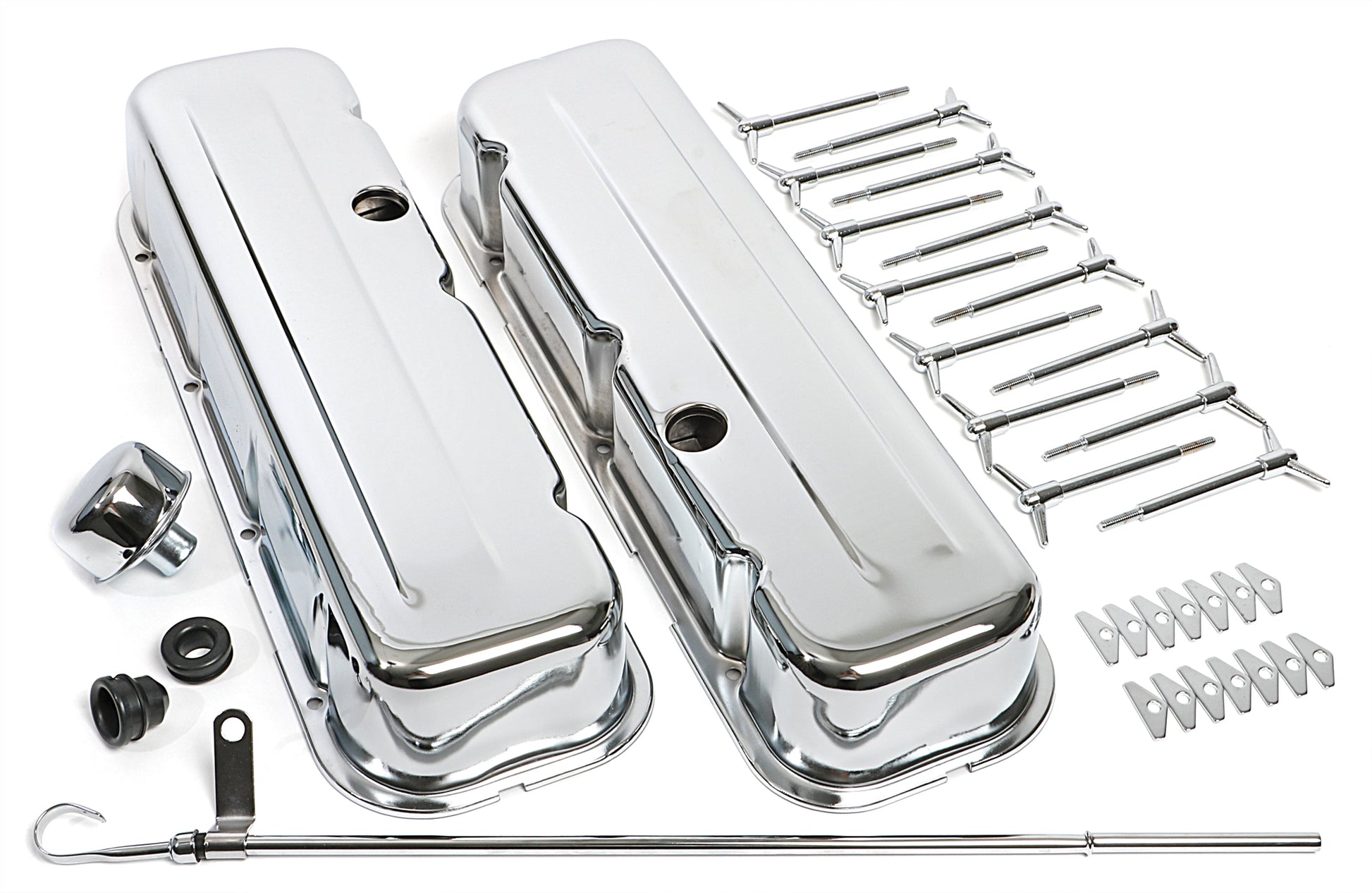 - Contents: valve covers, hold down tabs, valve cover wing nuts, breathers, breather grommets, dipstick & tube,