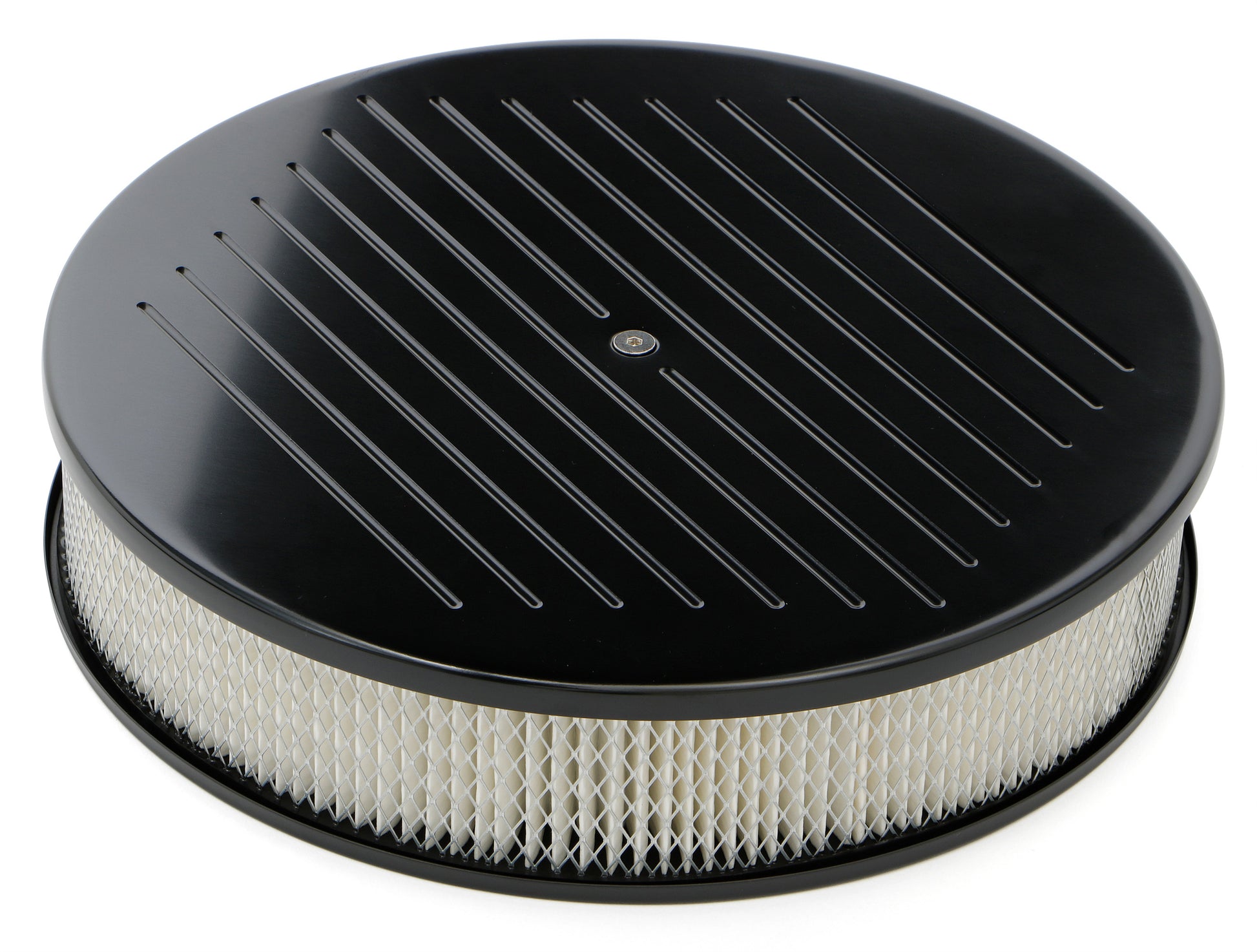 Trans-Dapt Performance Round Air Cleaner Set; Pinstriped (Ball-Milling); 14 In. Diameter 3 In. Tall; Recessed Base- Black Aluminum Top/ Black Steel Base 7470